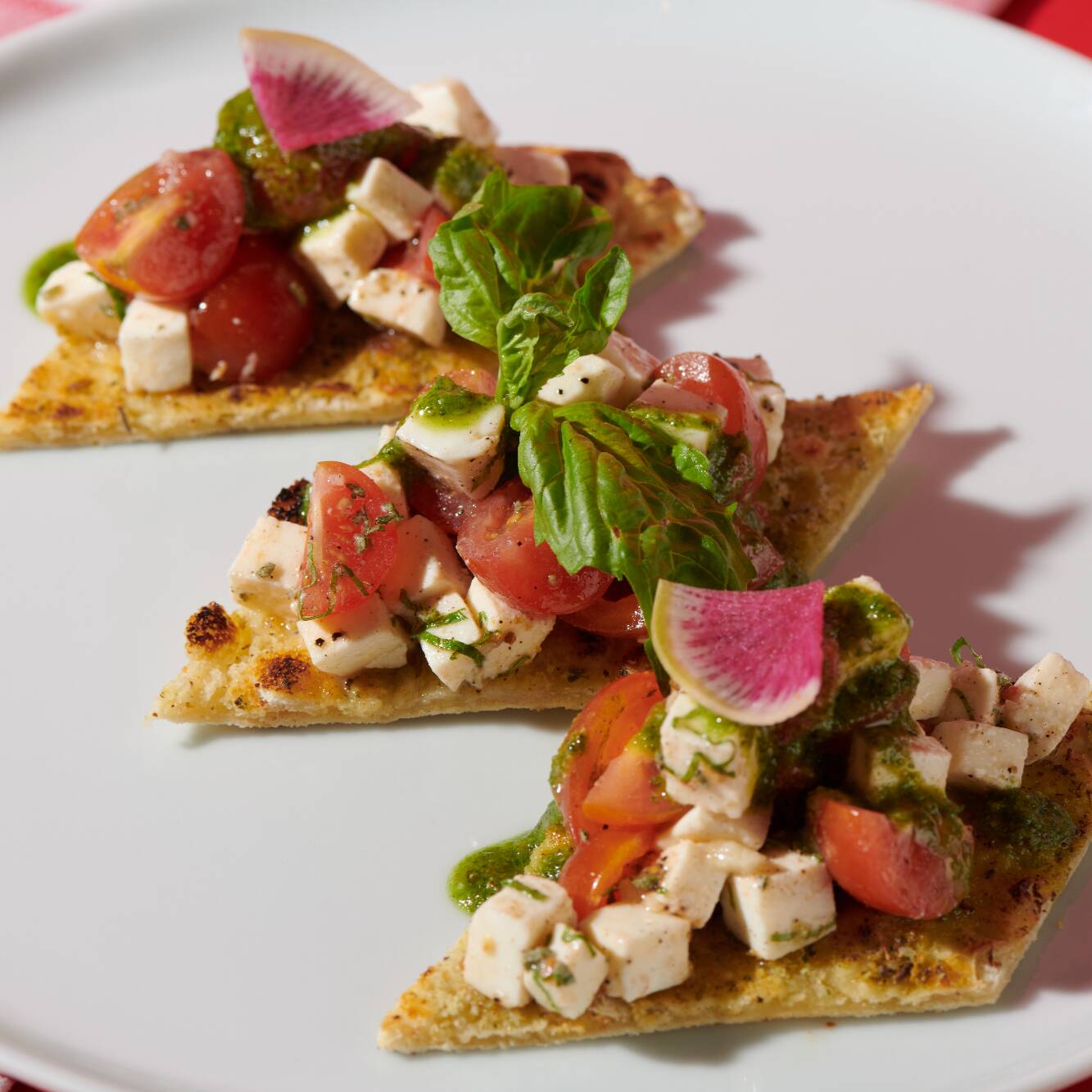 Pan pizza, queso mozzarella fresco, tomate cherry, pesto, salvia y jugo de limón.
