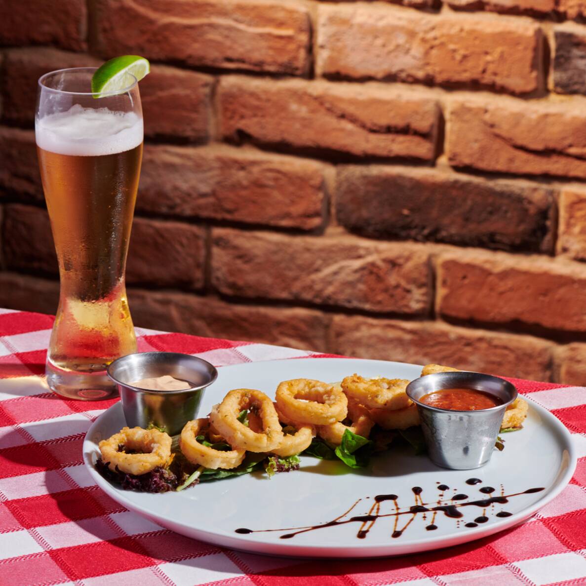 Aros de calamar sazonados y fritos acompañados de una mini ensalada mixta, aderezo, chipotle, salsa marinada y reducción de balsámico.