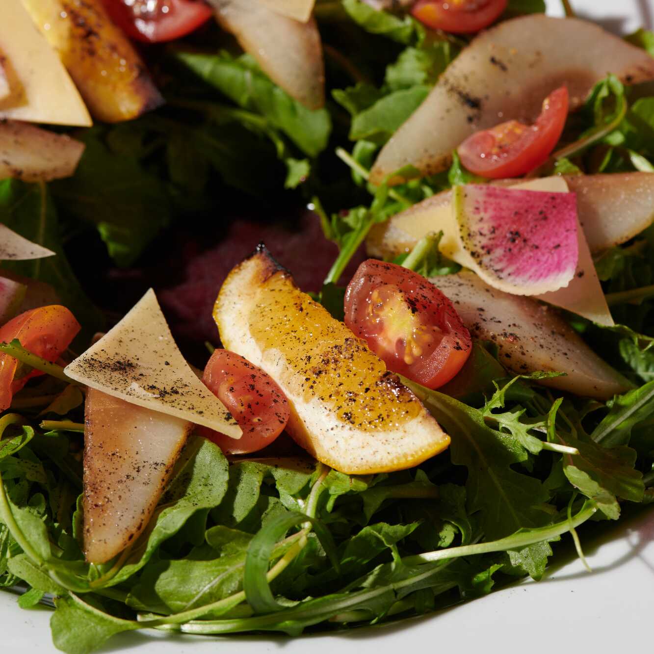 Finas rodajas de carne, queso mozzarella y arúgula.