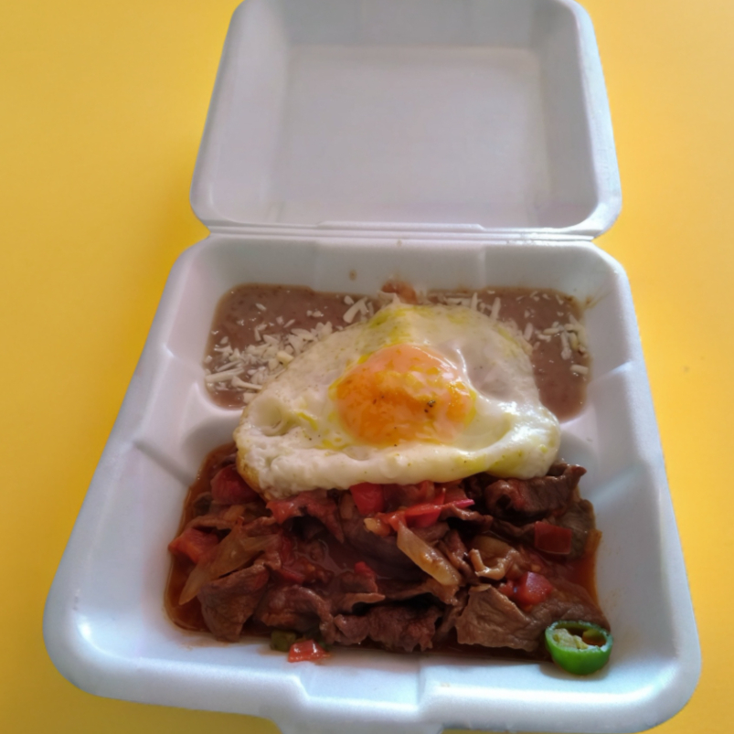 Huevo revuelto con cecina casera, bañados en salsa de guajillo o salsa verde. Acompañado de frijoles.