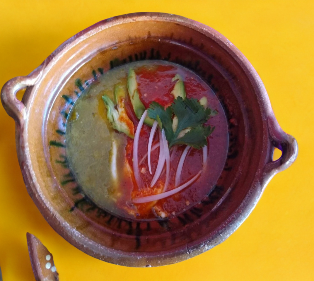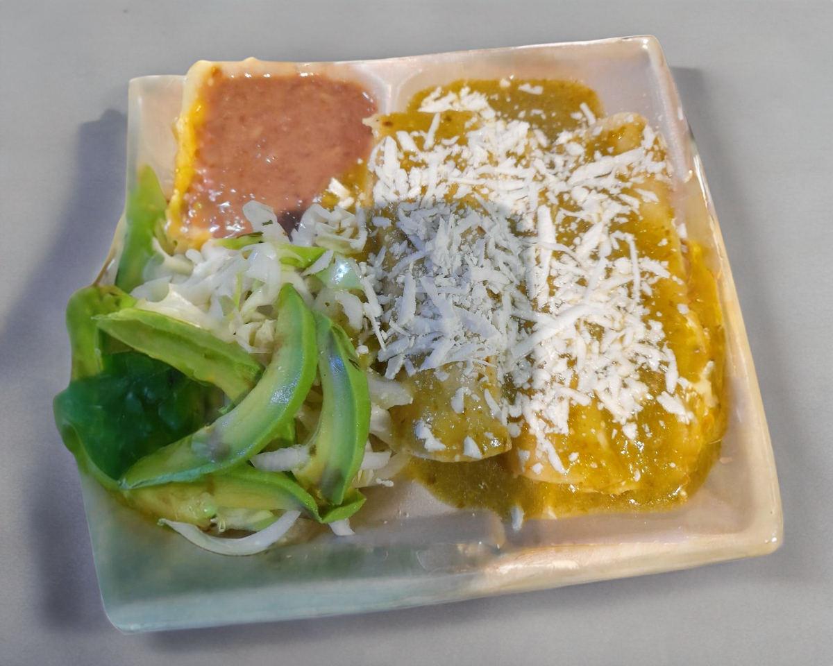 aporreadillo, rojo o verde, acompañado de dos enchiladas verdes, huevo al gusto, frijol y queso gratinado