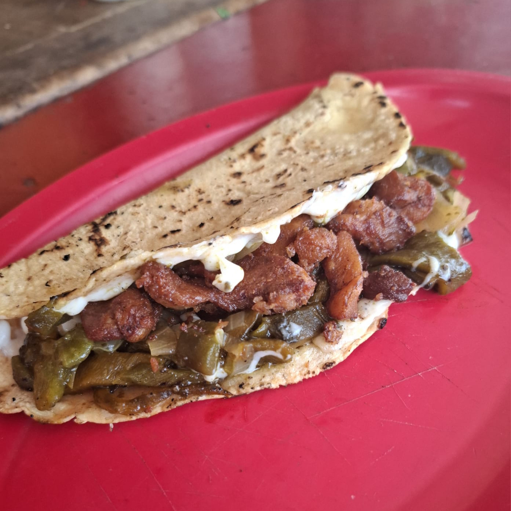 Tortilla de masa de nixtamal hecha a mano. Rajas, chicharrón crujiente y queso. Lechuga, crema y salsas aparte.