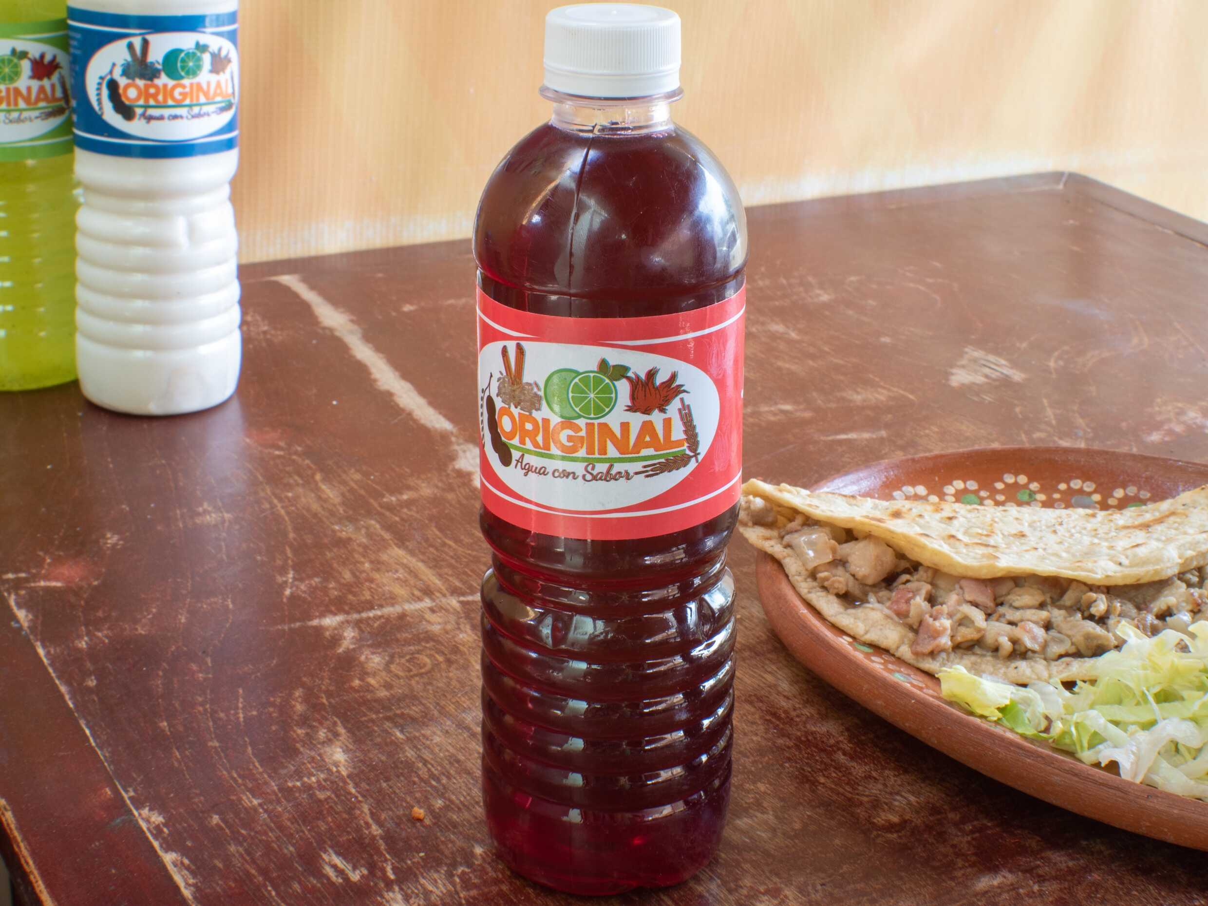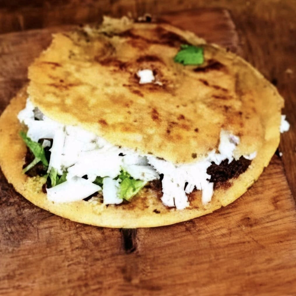 Tortilla de masa de nixtamal hecha a mano. Bistec de puerco con tocino cebolla y queso. Lechuga, crema y salsas aparte.