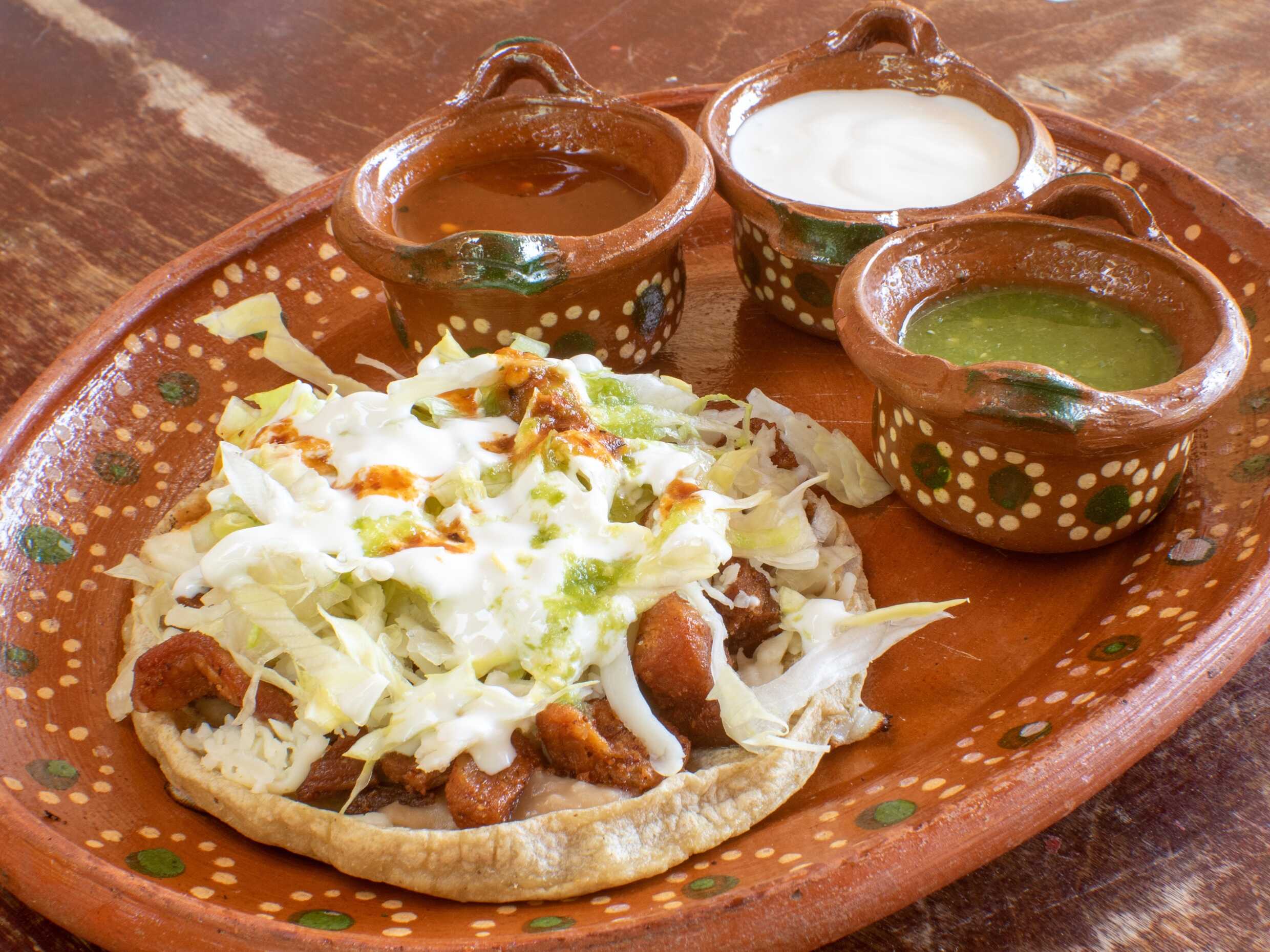 Tortilla a mano de masa de nixtamal, con queso y tinga de pollo. Lechuga, crema y salsas aparte.