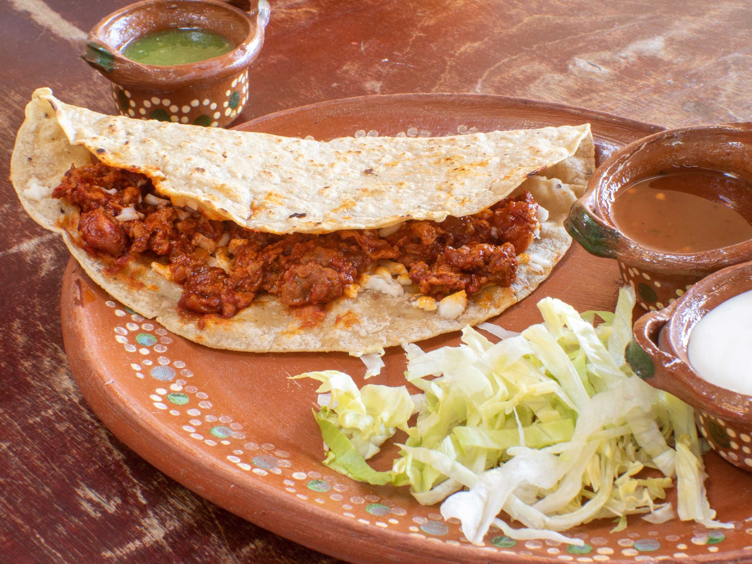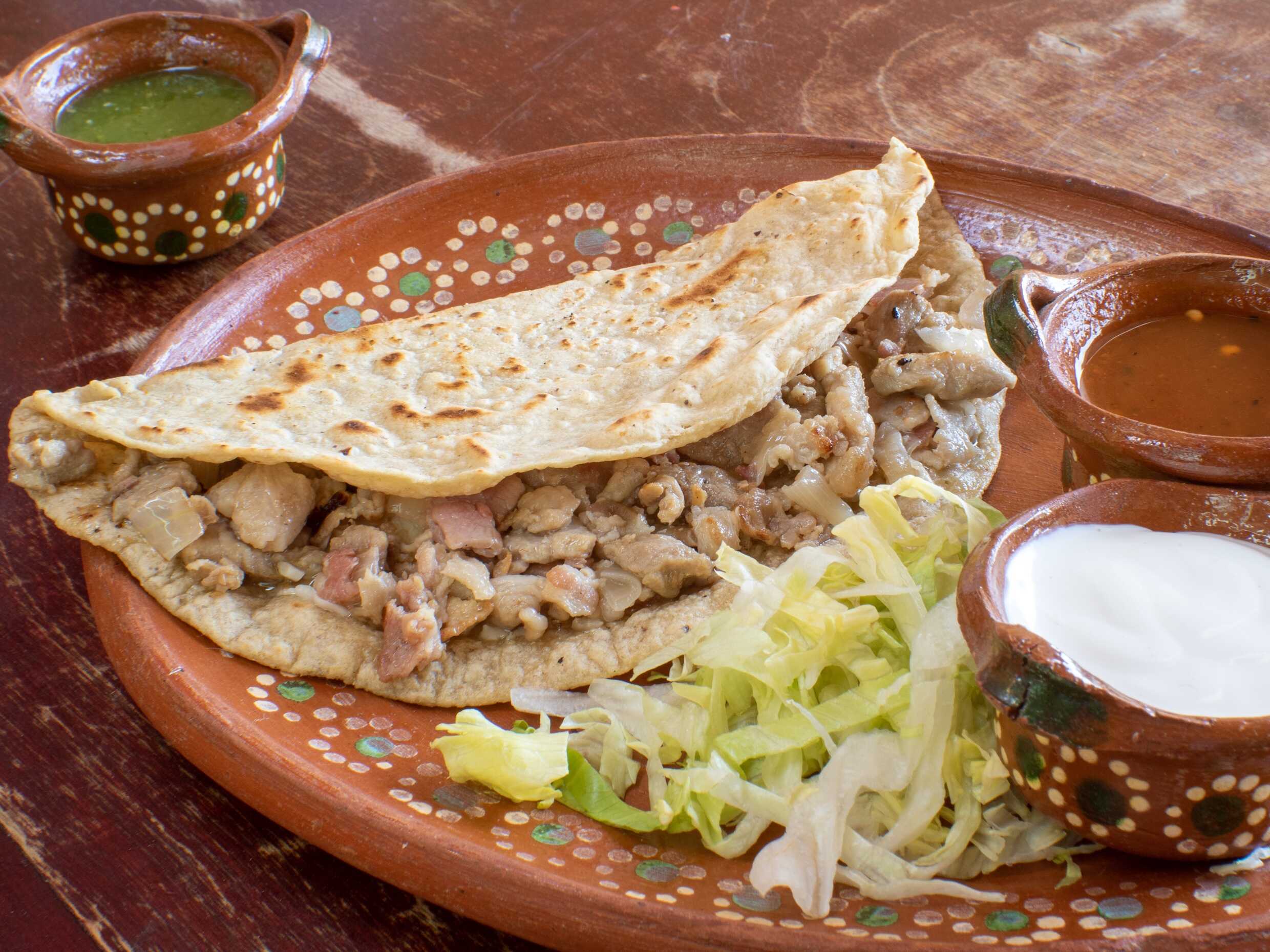 Tortilla de maíz hecha a mano con chorizo regional, queso asadero, lechuga, crema y salsas aparte.