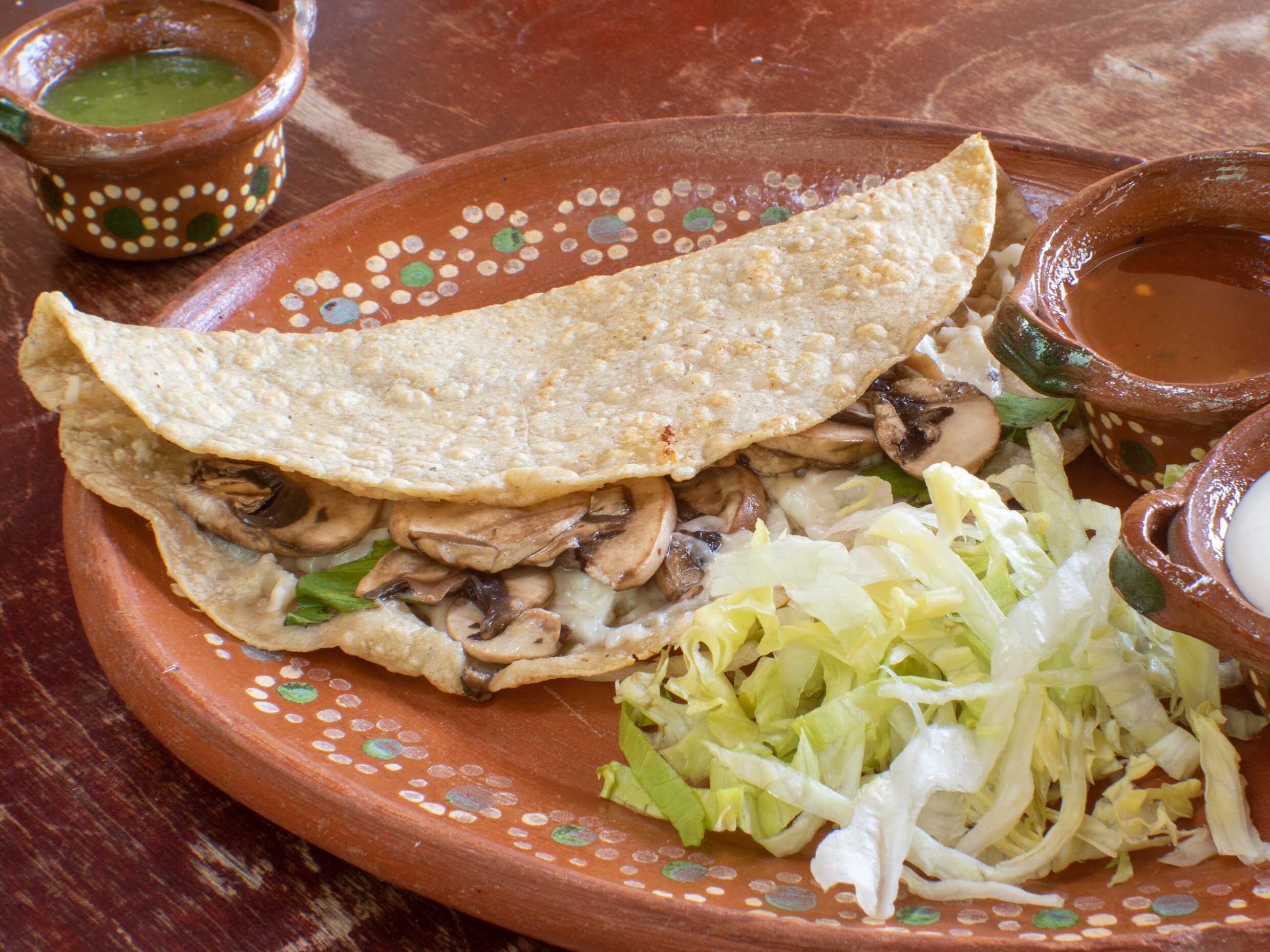 Tortilla de masa de nixtamal hecha a mano con champiñones queso y epazote. Lechuga, crema y salsas aparte.