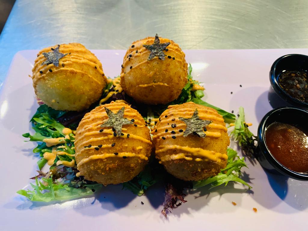 Mini esferas de arroz empanizadas con salsa de anguila y mayo spicy