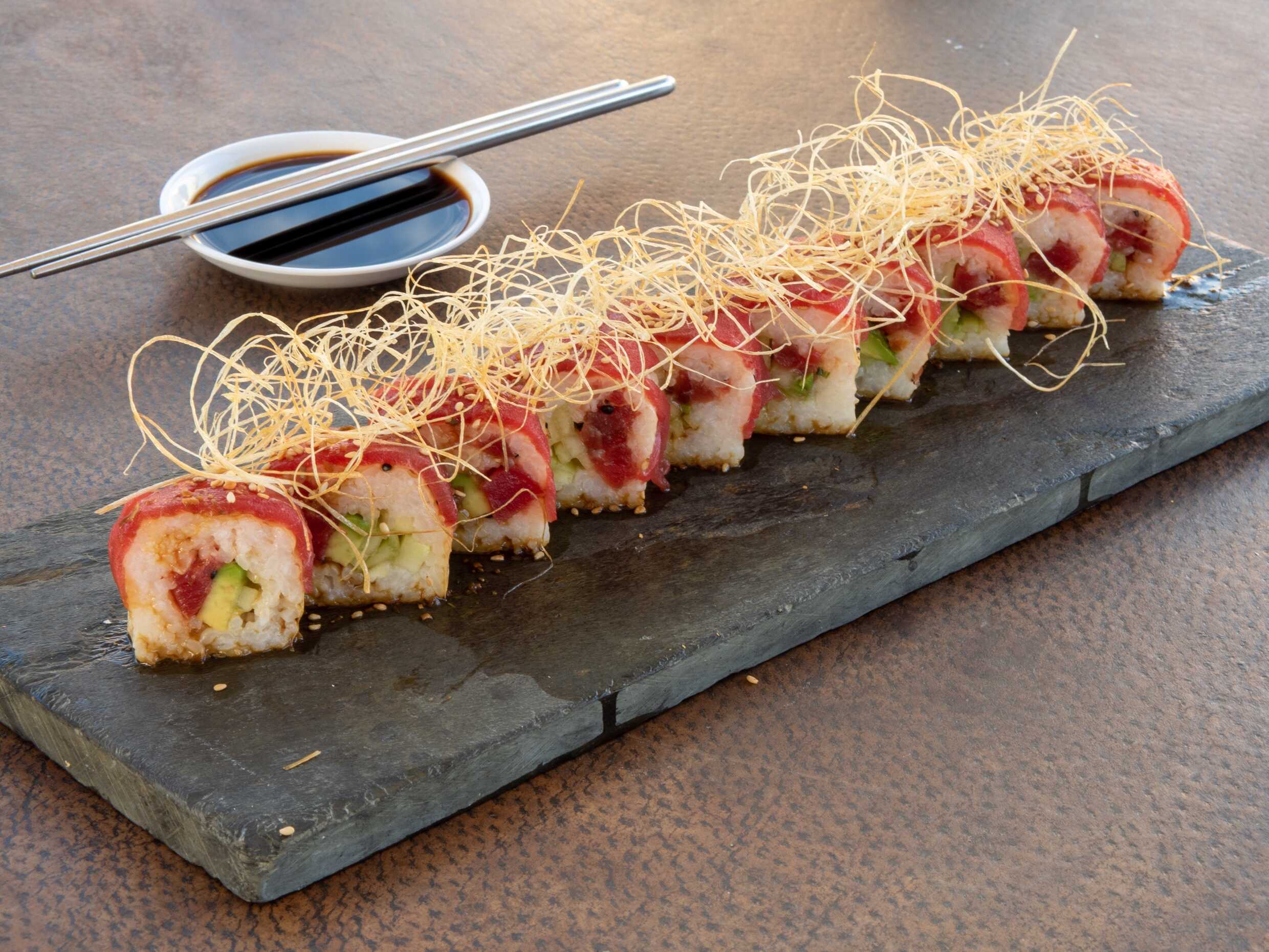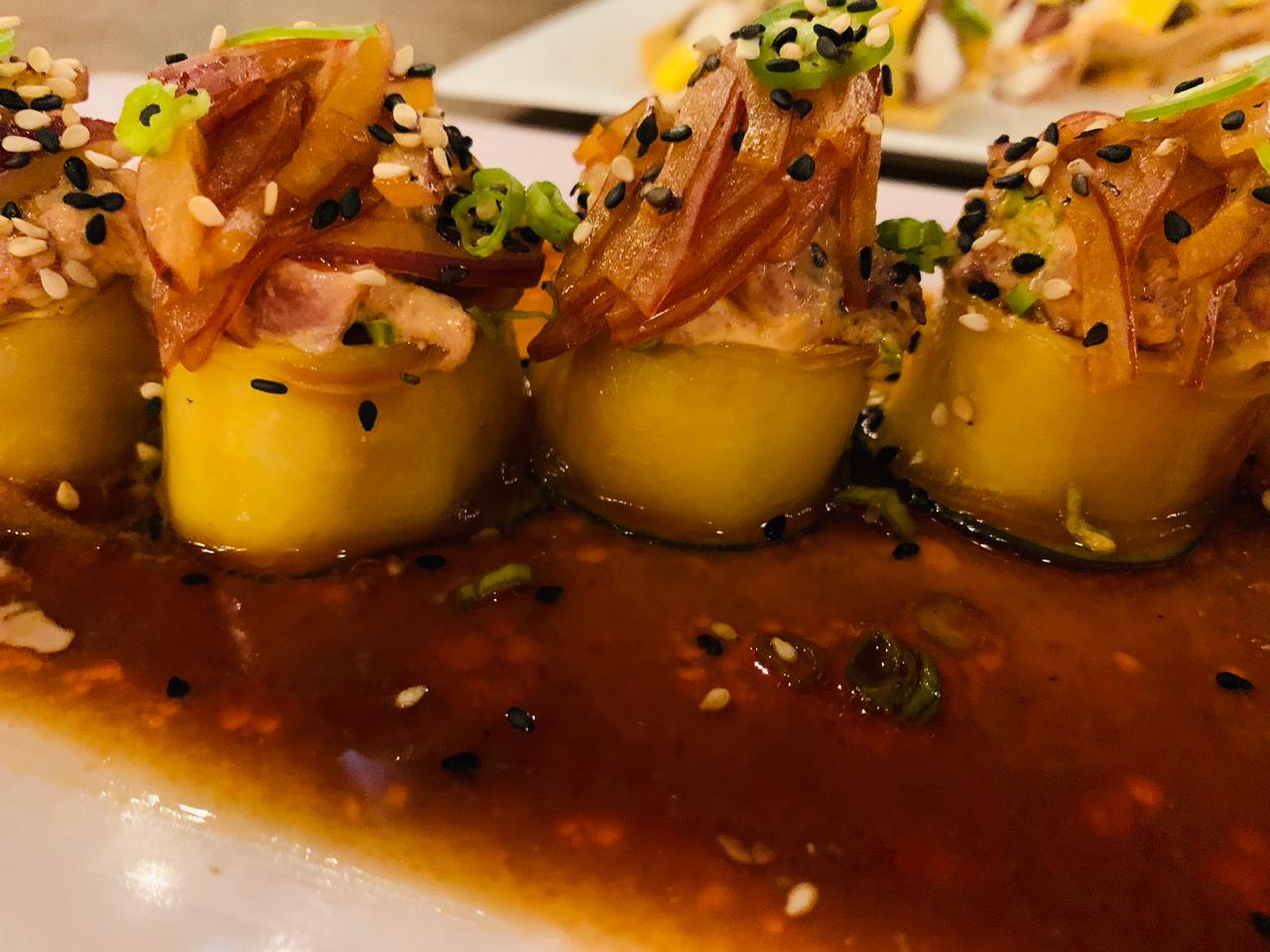 Mango, tuna fresca, kanikama, pepino y aguacate envuelto en papel arroz, con topping de tuna fresca con mango.