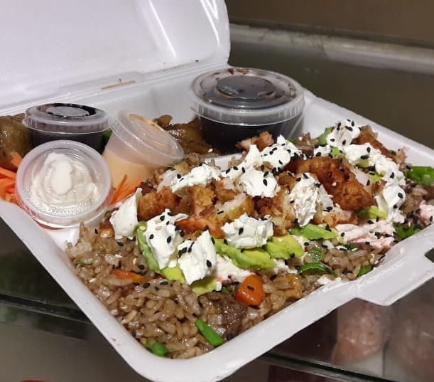 Arroz frito (240 gramos)con vegetales ( zanahoria y calabaza entro otros ) y pollo( 100 gramos) salsa de chile en soya y salsa mayo spice. queso crema aguacate y salsa tampico