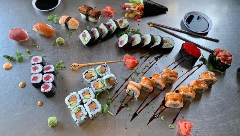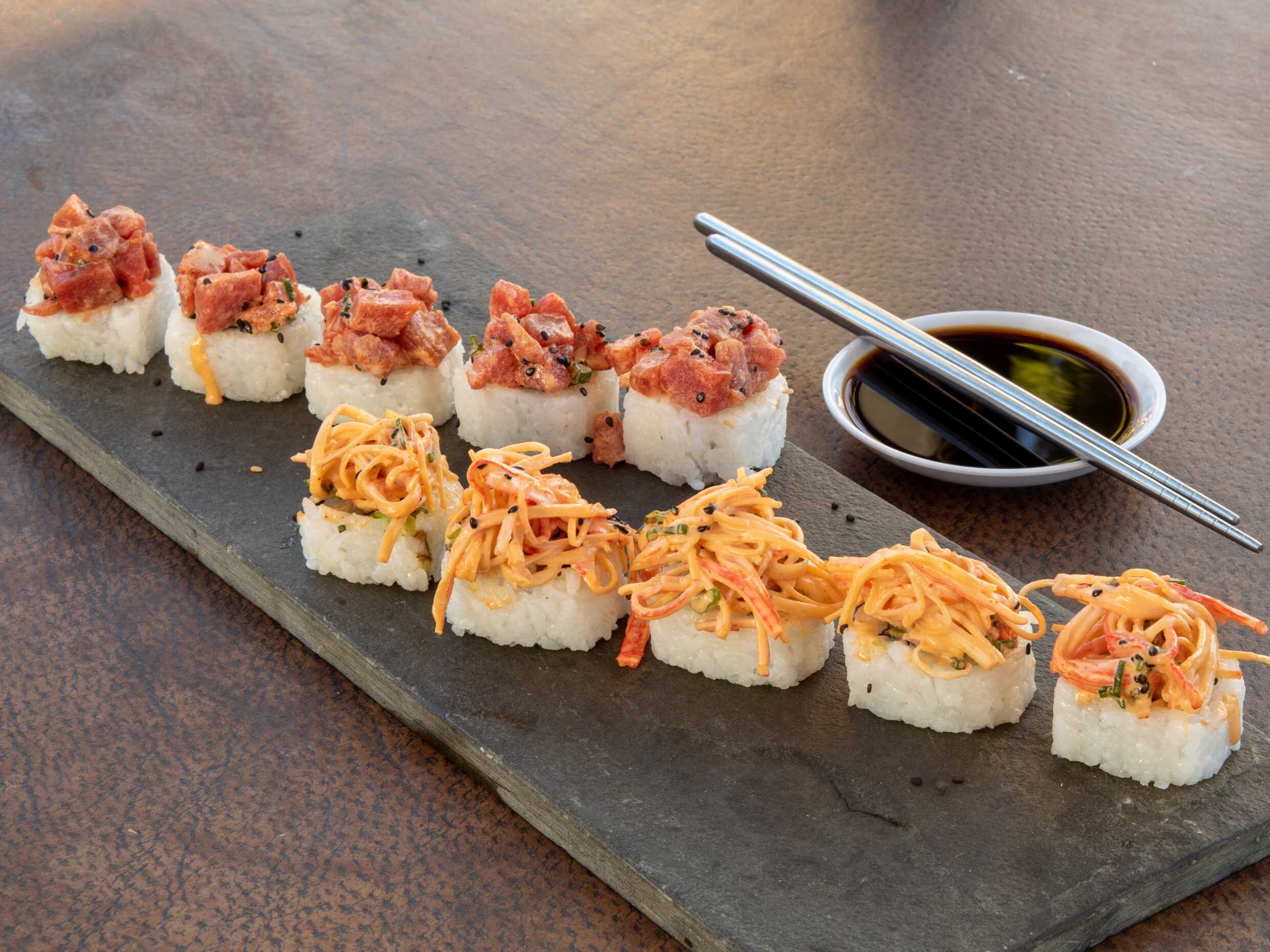 Arroz por fuera relleno de aguacate y pepino, por fuera spicy tuna y kanikama spicy.