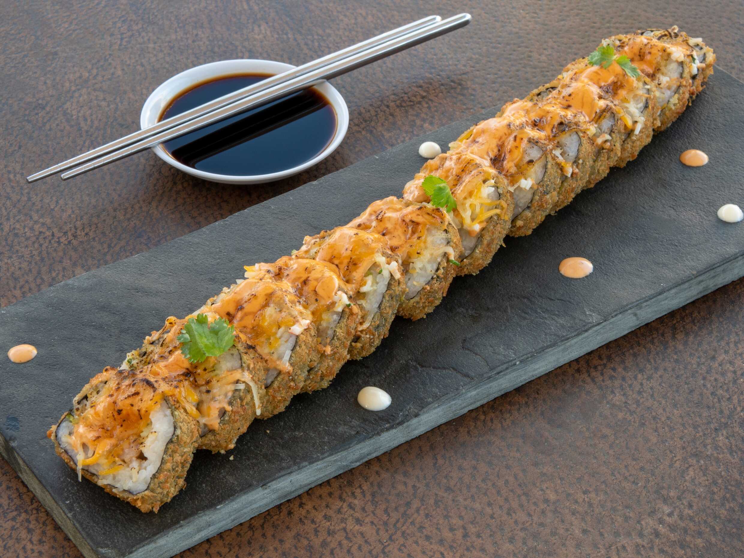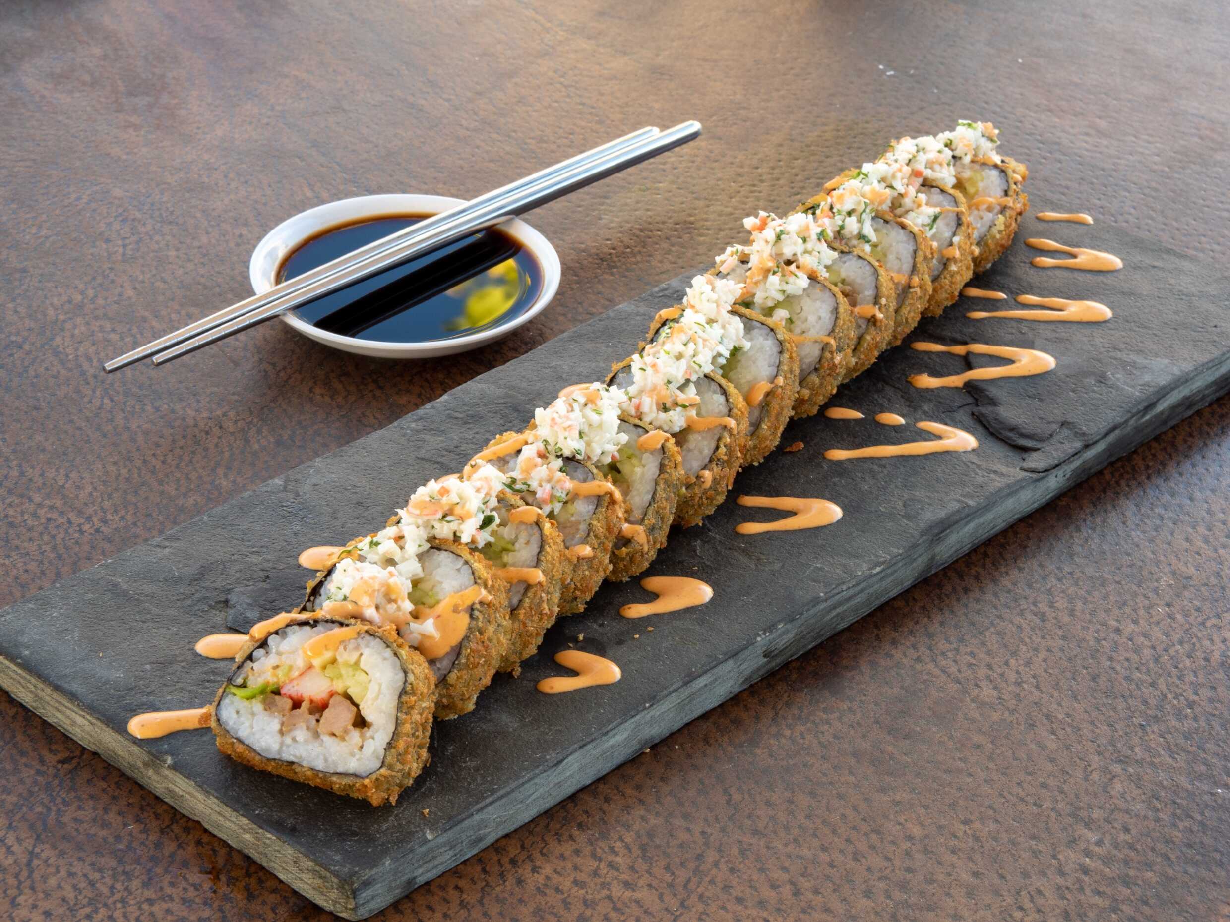 Rollo relleno de philadelphia, surimi, pepino y aguacate, empanizado y frito