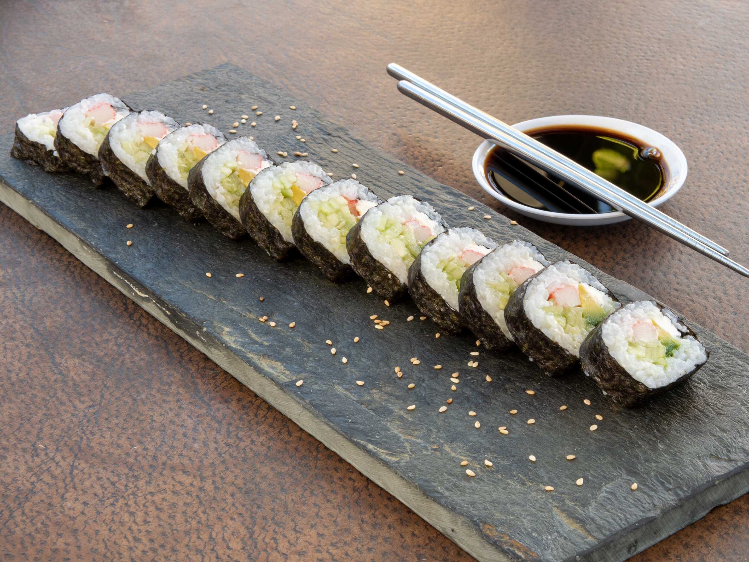 Rollo relleno de philadelphia, surimi, pepino y aguacate.