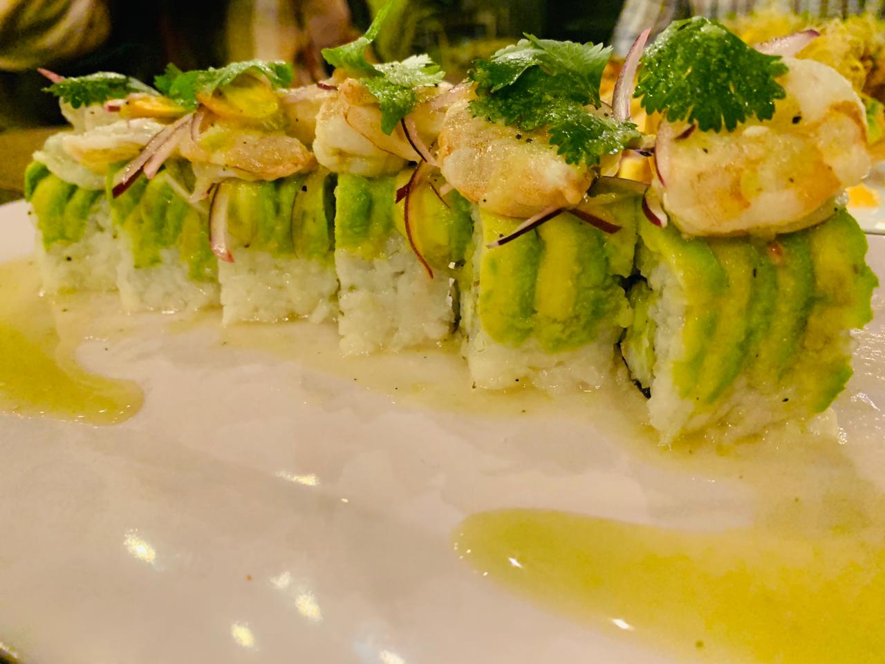Arroz por fuera relleno de pepino y camarón cocido, envuelto en aguacate, topping de camarón crudo en aguachirle y cebolla morada.