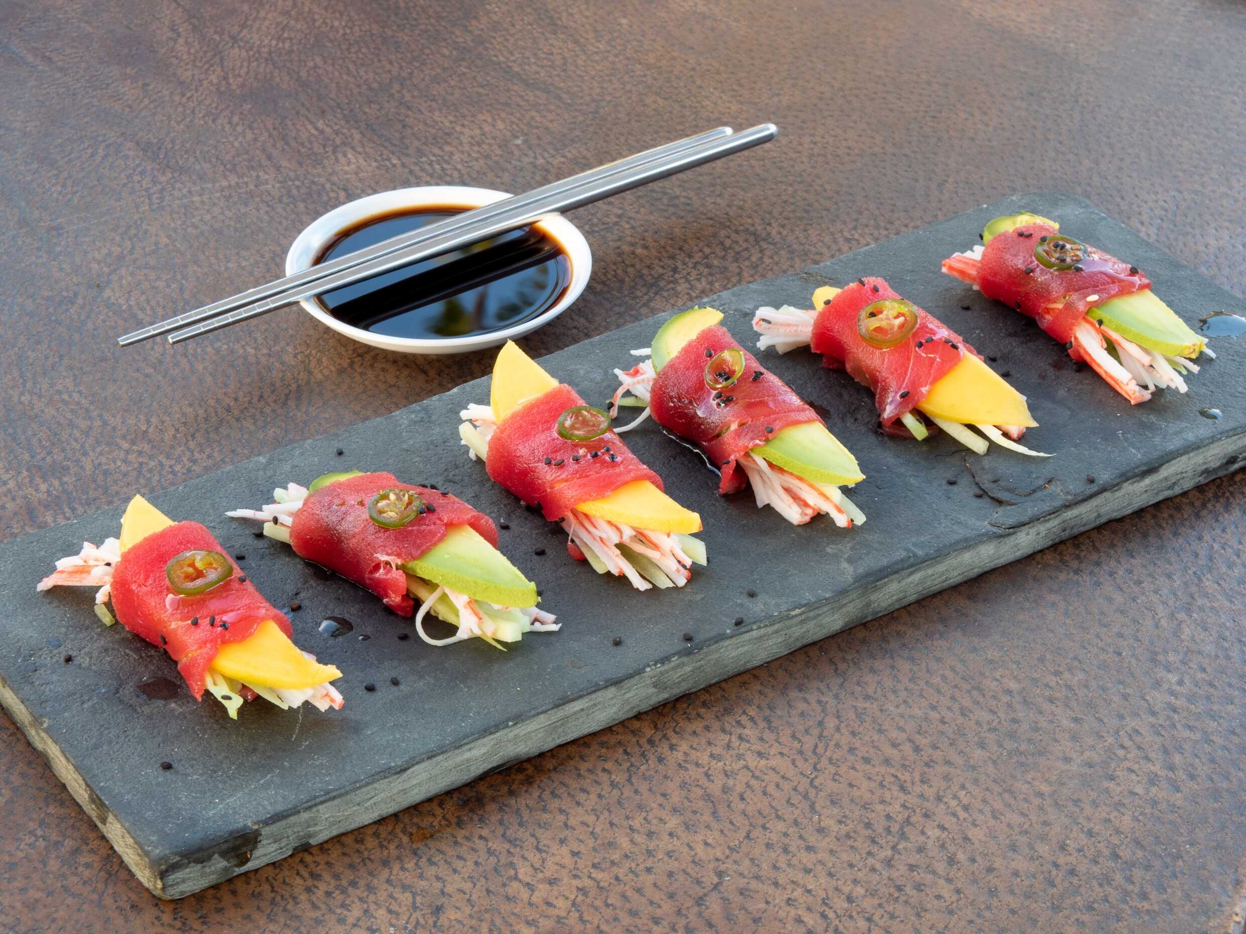 Pepino, aguacate, kanikama, mango envuelto en tuna fresca.