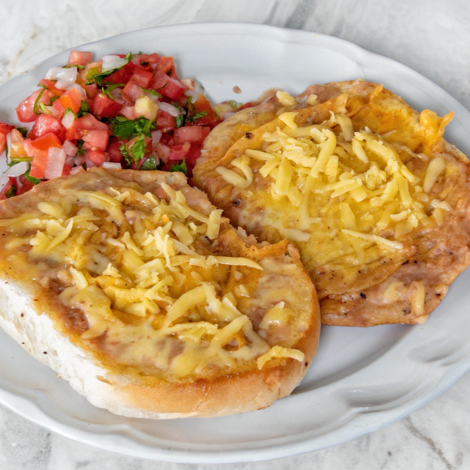 Una rebanada de pan con frijoles, queso chihuahua y salsa mexicana.