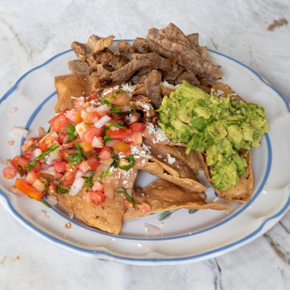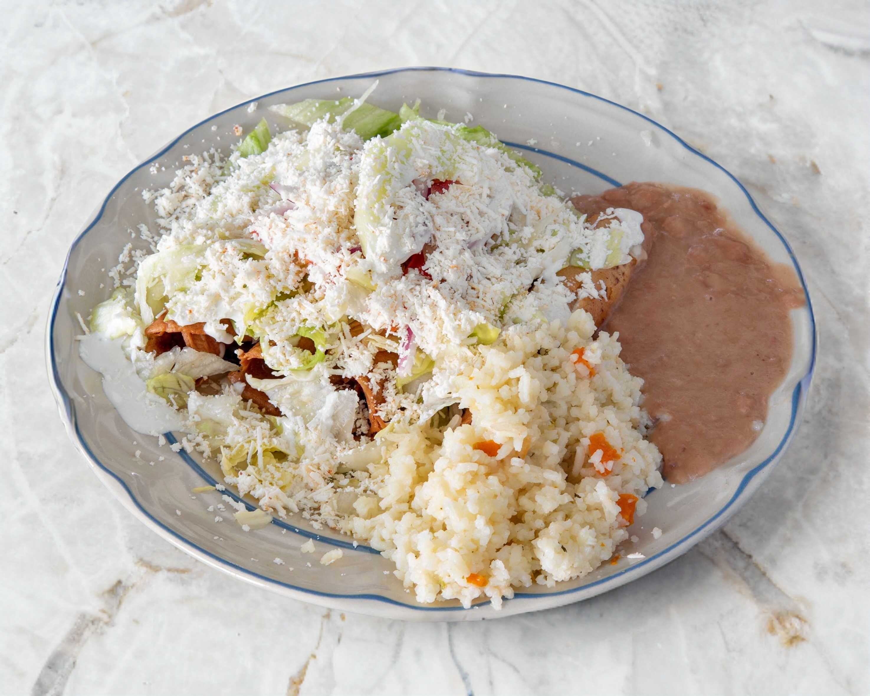 3 Tortillas de maíz frita con frijol, pollo deshebrado, ensalada del día, crema y queso, acompañado de arroz y frijoles.