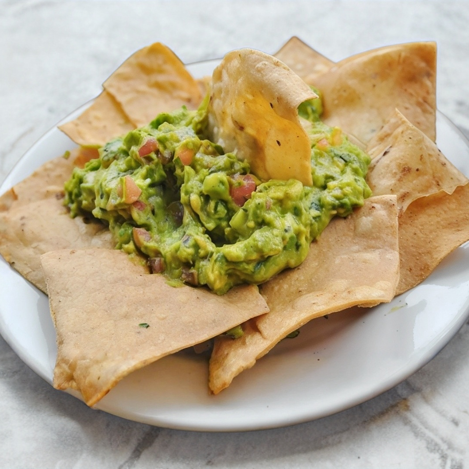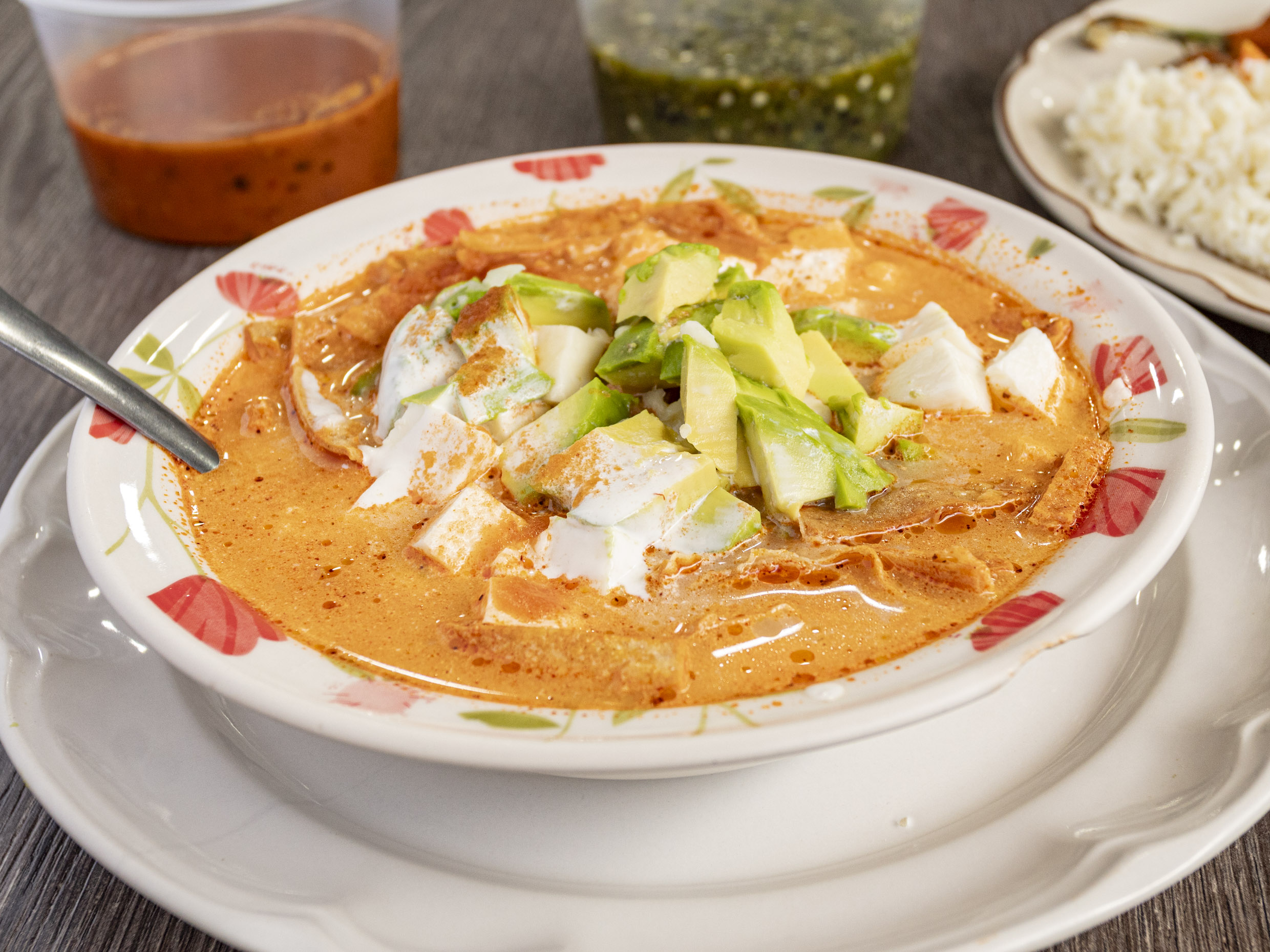 Frituras de maíz en caldo rojo con queso panela en cubitos, aguacate y crema.