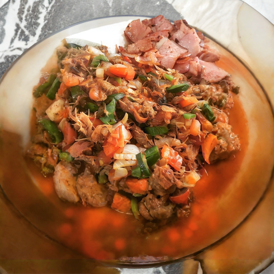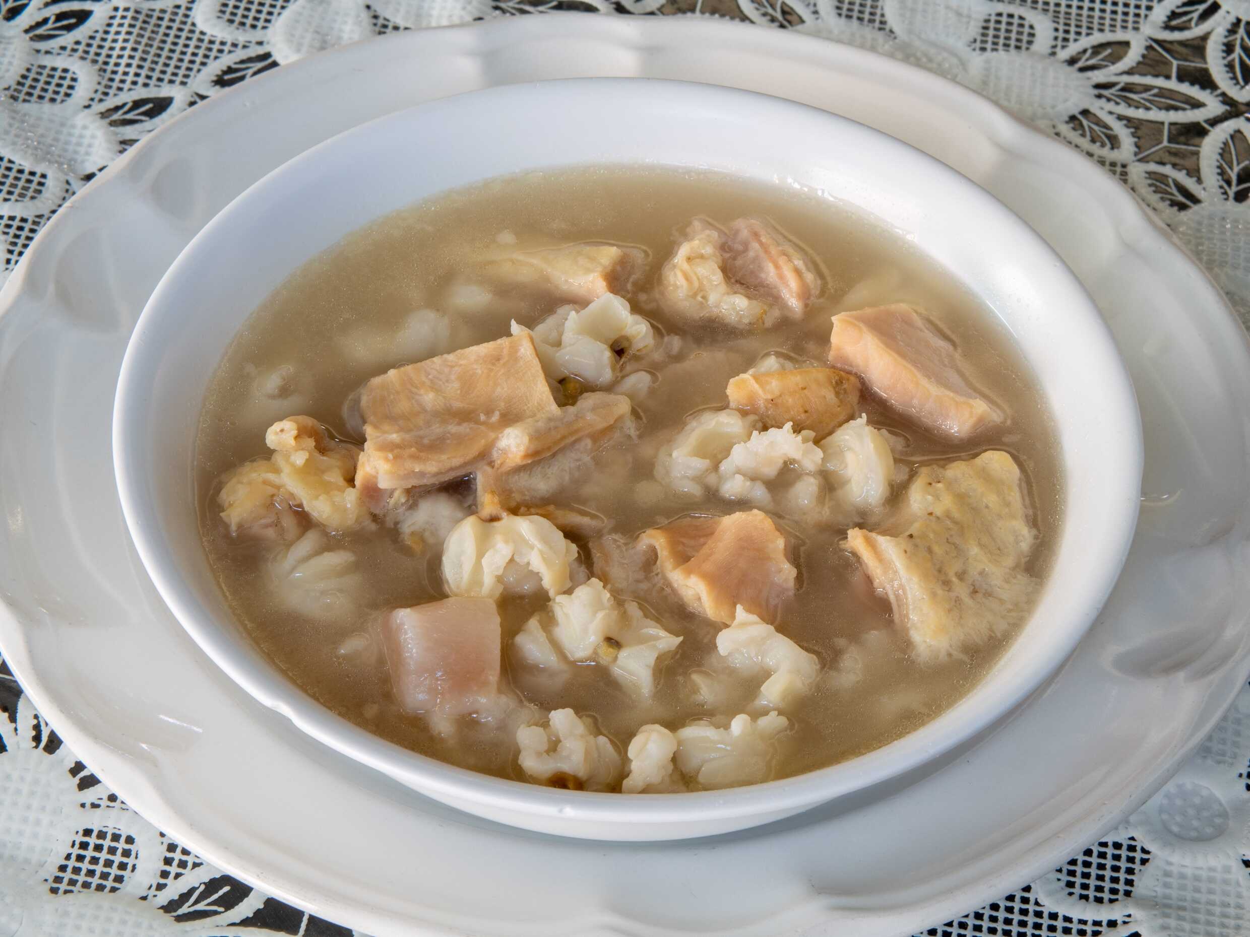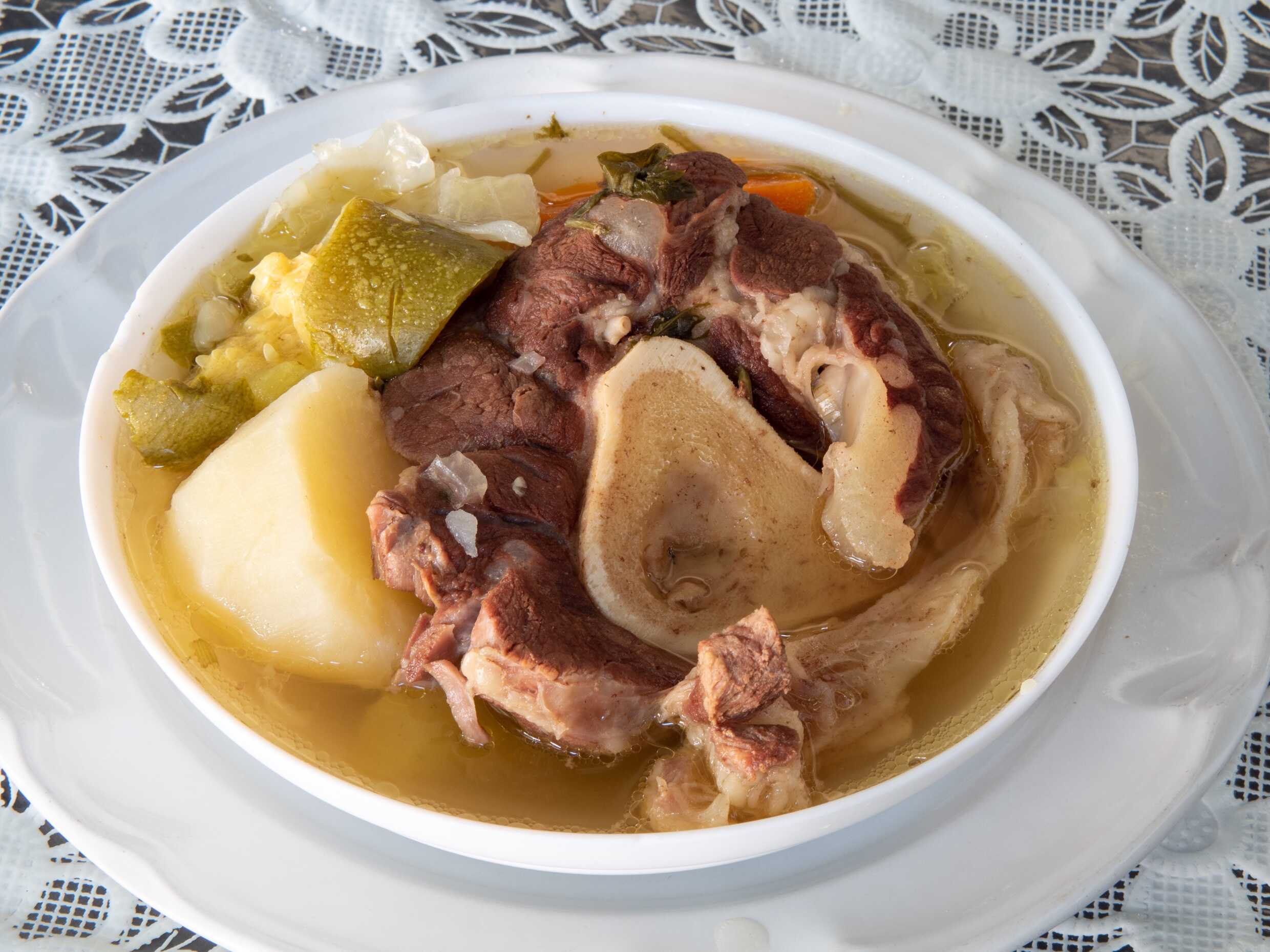 Zanahoria, papa, chayote, elote, repollo y chamorro de res. Acompañado de arroz.