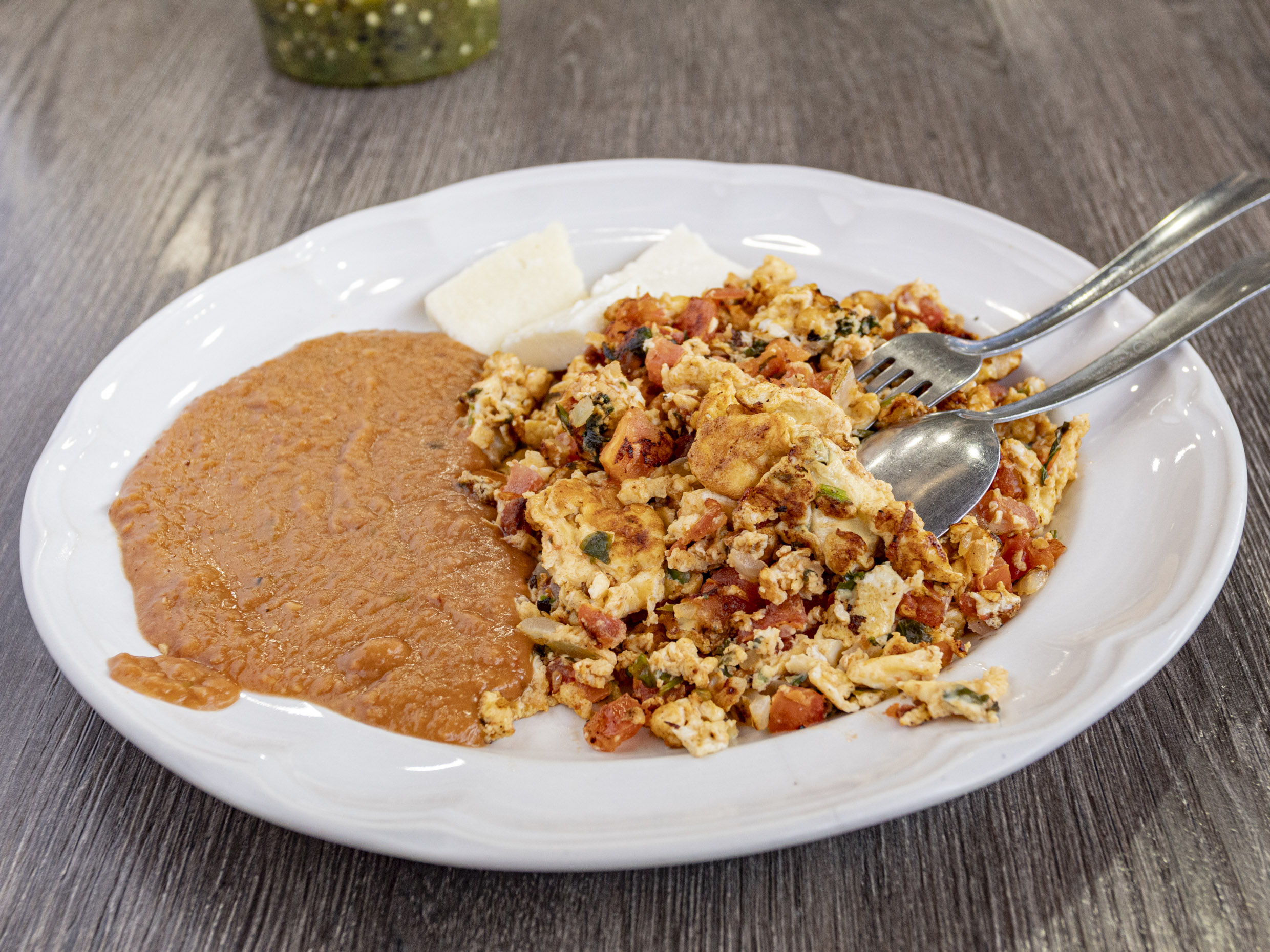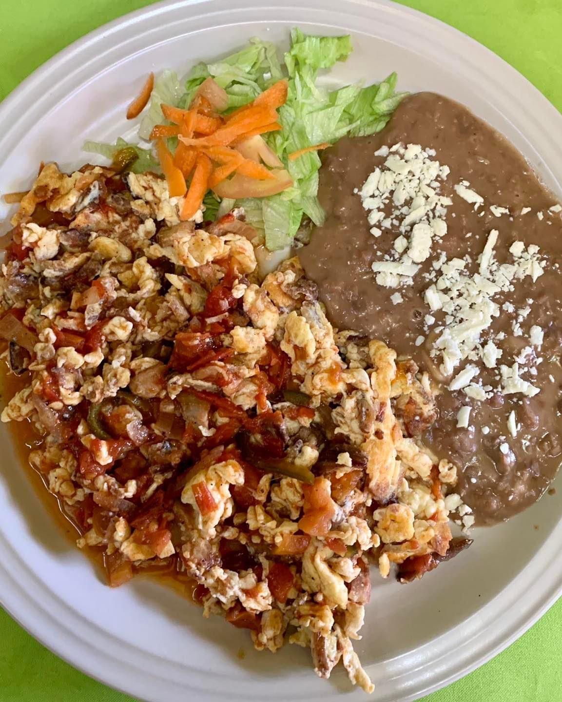 Huevo revuelto con tomate, cebolla y chile verde, acompañado de queso fresco y frijoles.