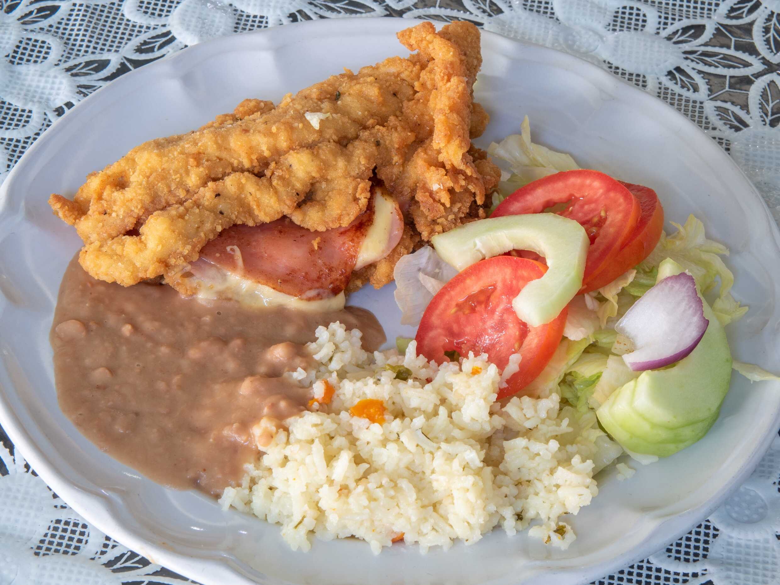 Filete de pollo empanizado con queso menonita, jamón, ensalada de de tomate, cebolla y chile serrano picados, acompañada de arroz y frijoles.