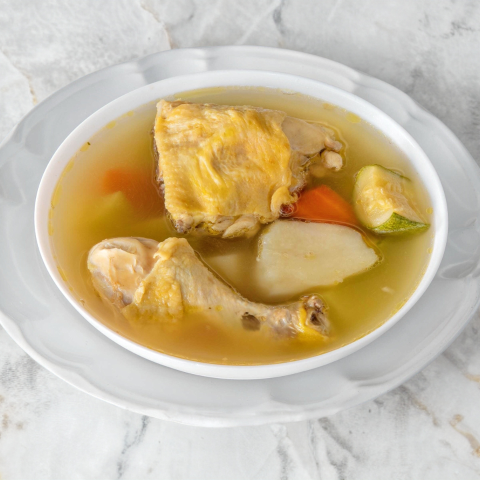 Zanahoria, calabaza, papa, chayote y dos piezas de pollo. Acompañado de arroz.
