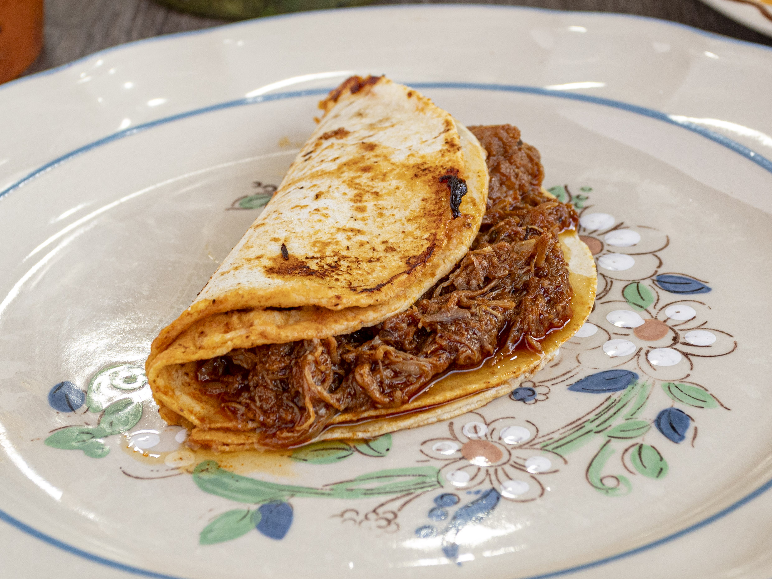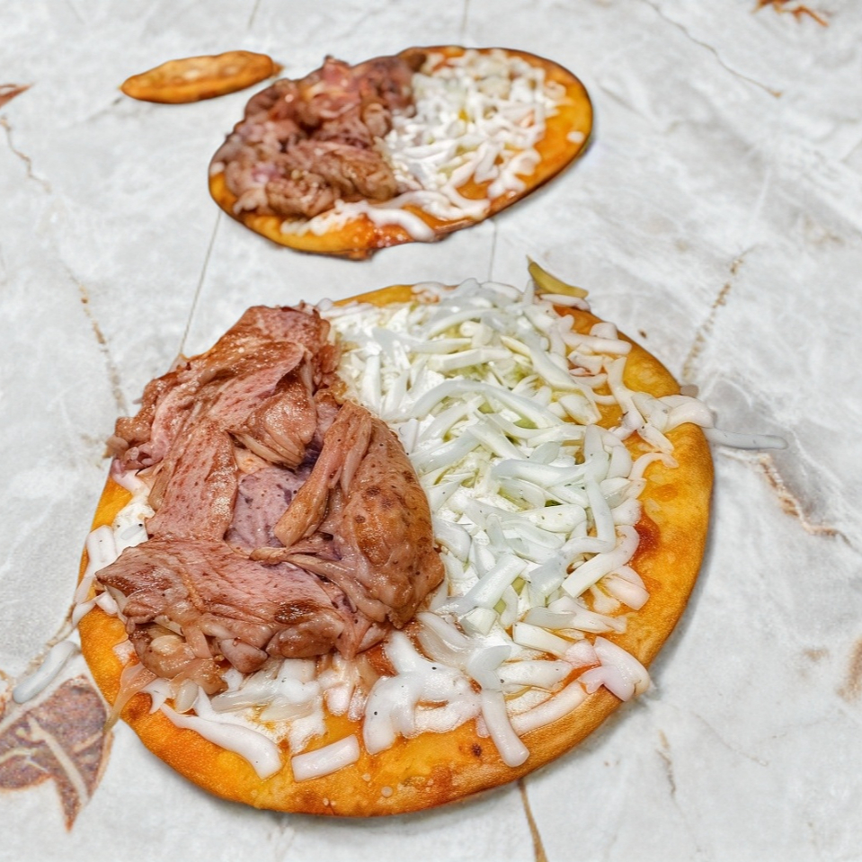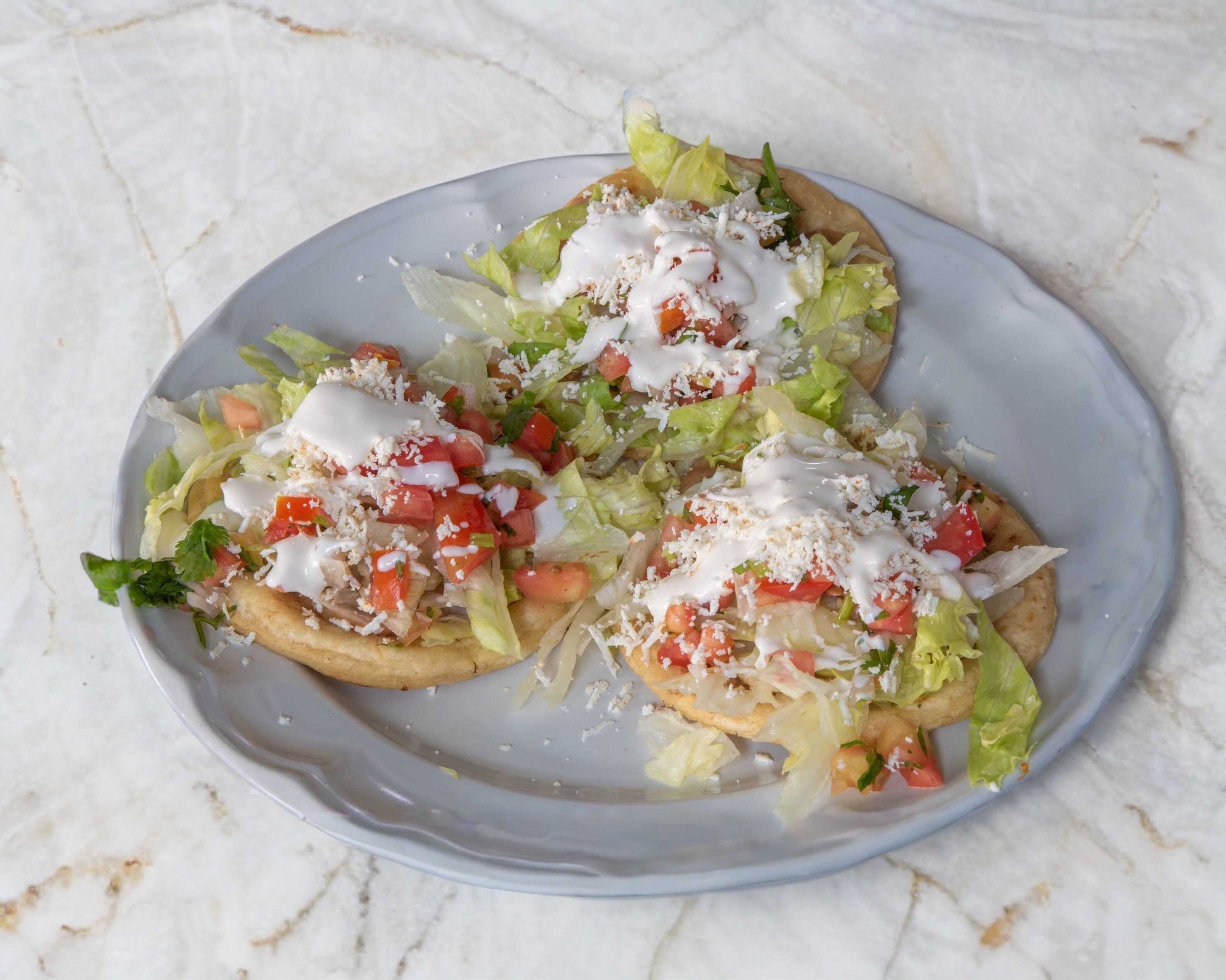 3 Tortillas gruesas de maíz con bordes, frijol, carne de res deshebrada, ensalada del día, crema y queso.