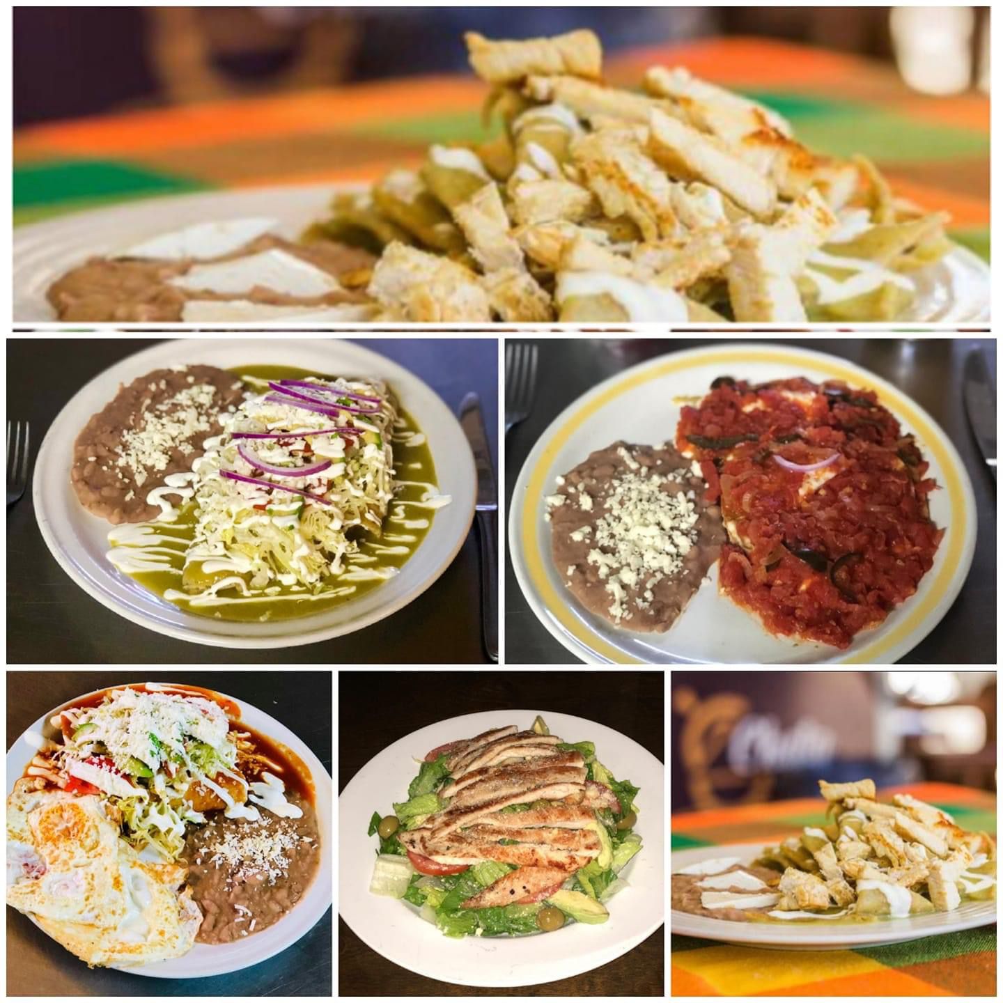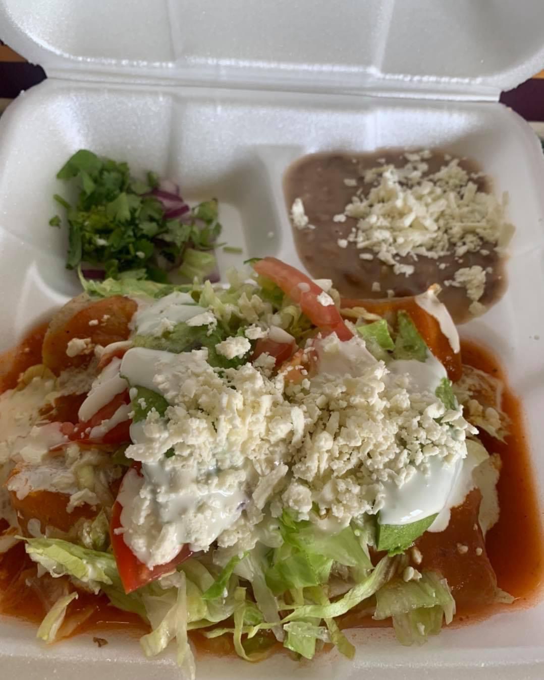 Cuatro tortillas de maíz rellenas de pollo, bañadas en salsa a elegir, acompañadas de ensalada del día, arroz y frijoles.