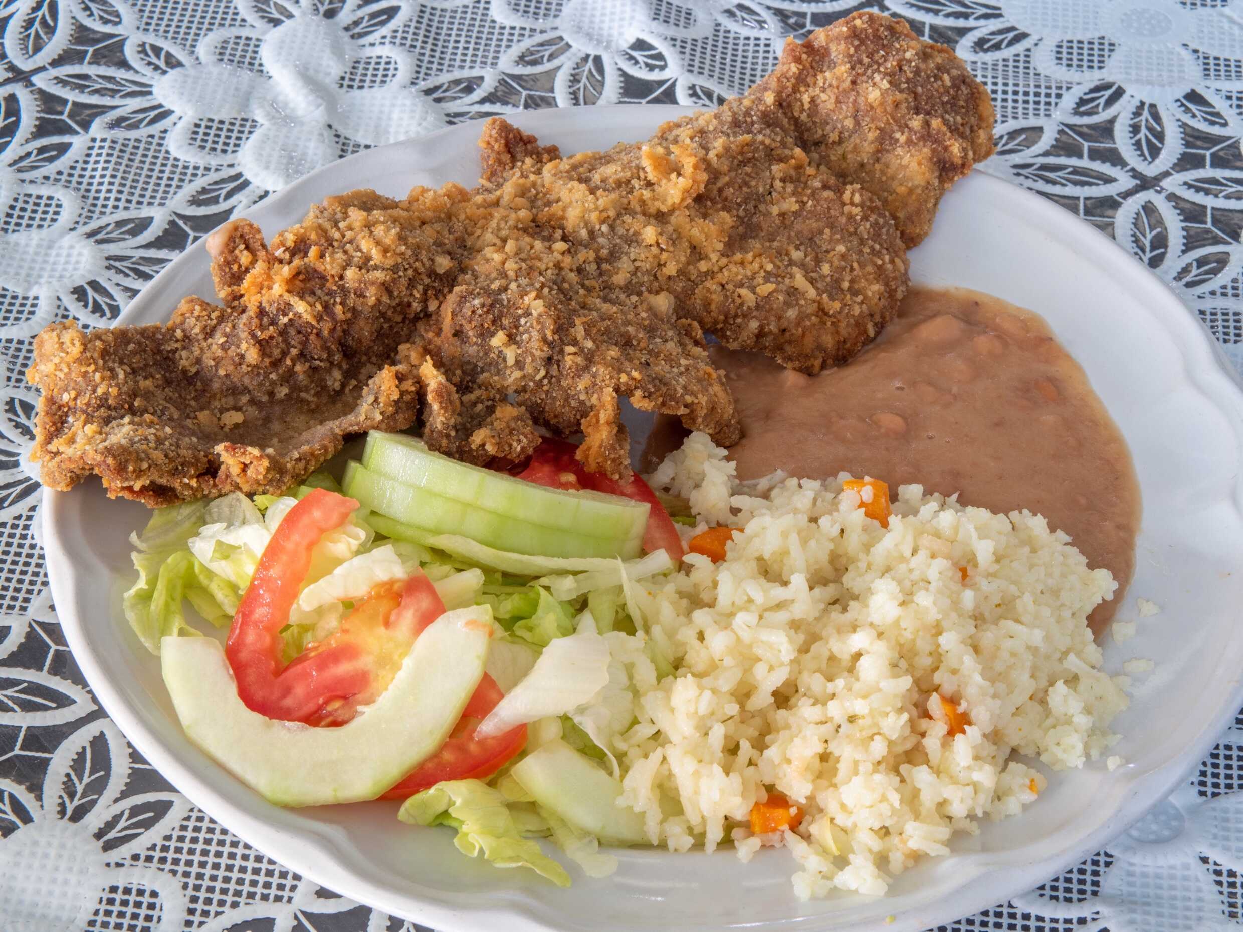 Filete de res empanizado con ensalada de tomate, cebolla y chile serrano picados, acompañada de arroz y frijoles.