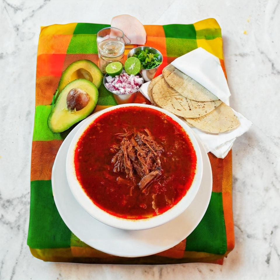 Gogote de res deshebrado en caldo rojo, cebolla, cilantro, tortillas y limón.