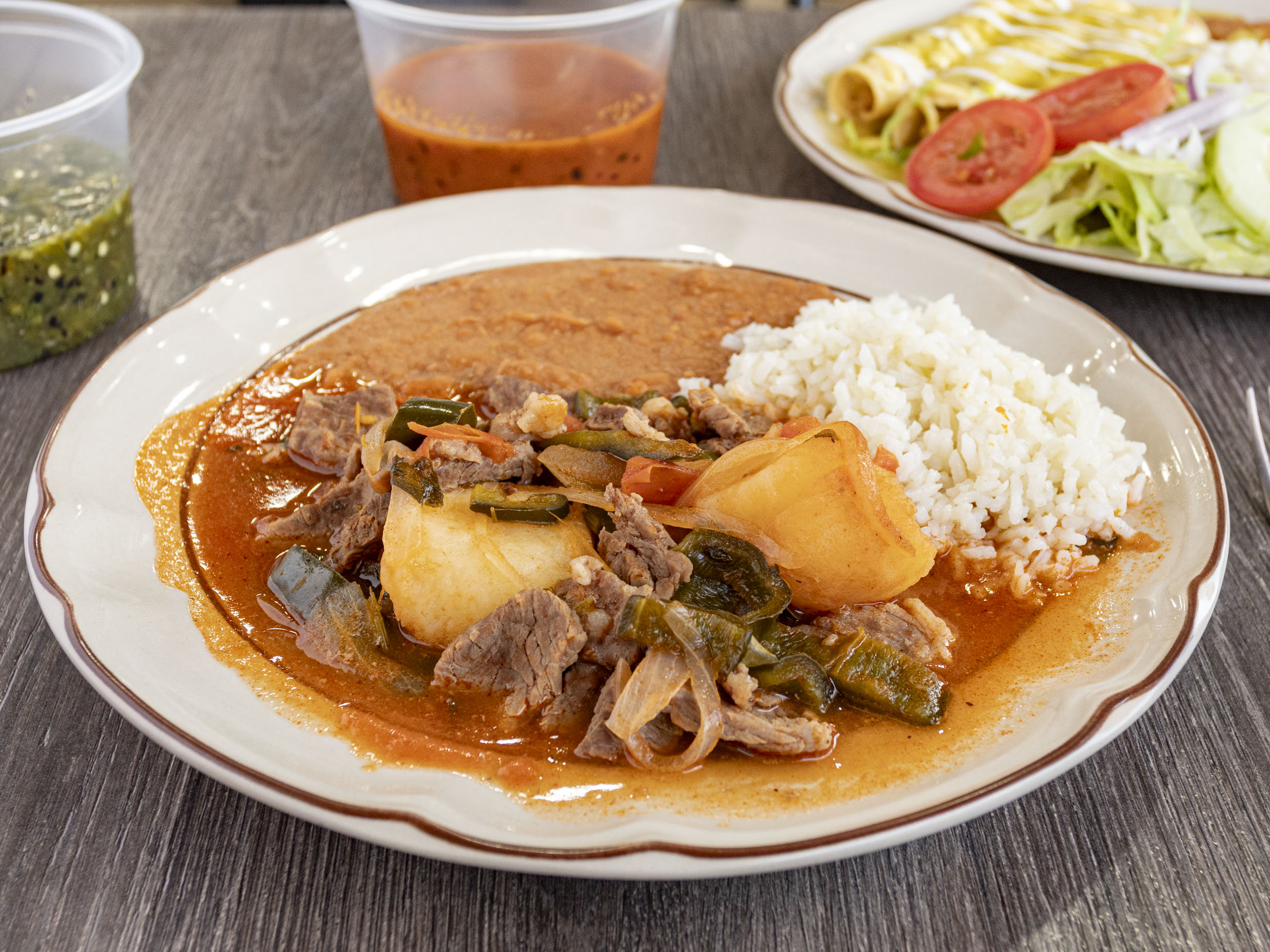 Filete de res cortado en trozos con papa, tomate, chile y cebolla, acompañado de arroz y frijoles.