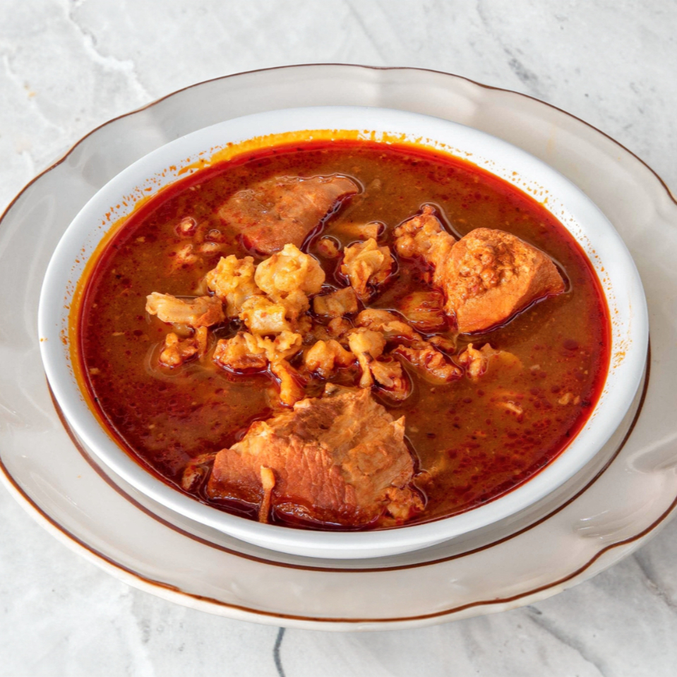 Costilla de cerdo, espinazo, maciza, maíz pozolero y salsa roja, acompañado de lechuga, rábanos, cebolla, cilantro y limón.