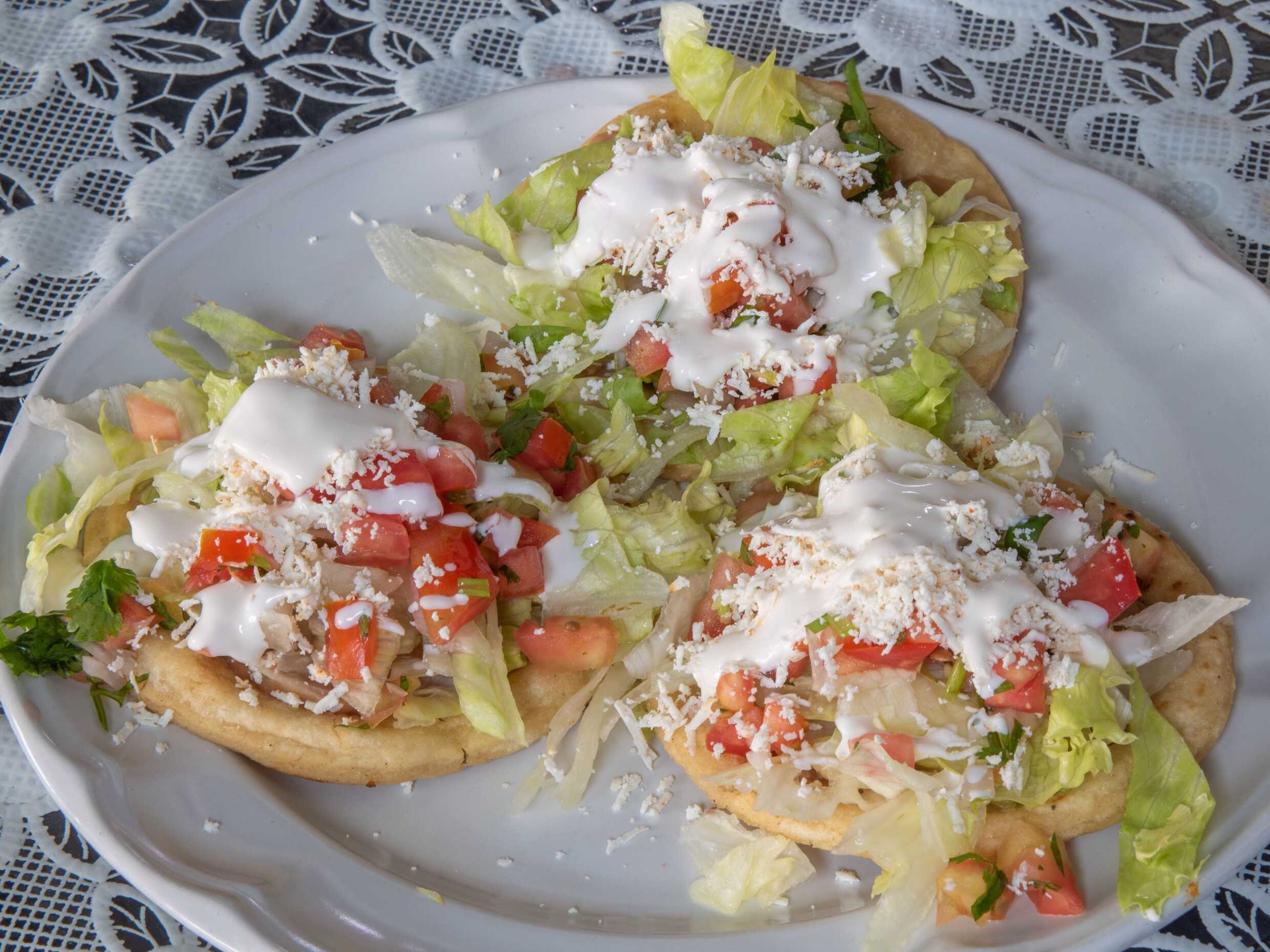 3 Tortillas gruesas de maíz con bordes, frijol, pollo deshebrado, ensalada del dpia, crema y queso.