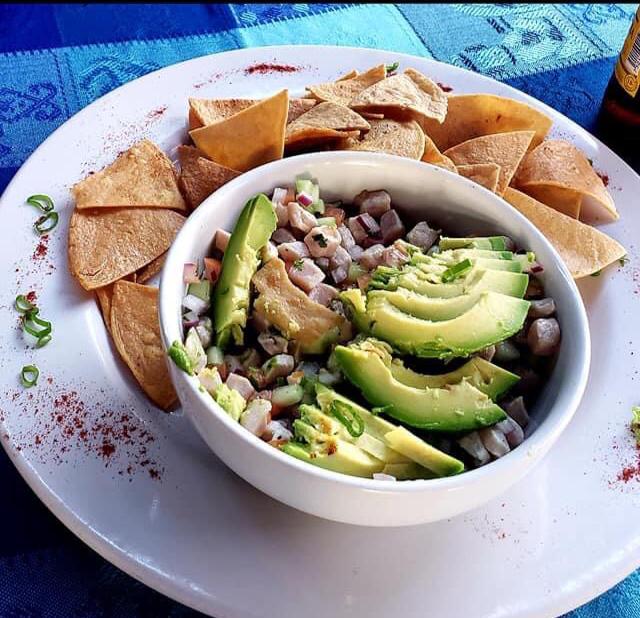 Trozos de camarón con tomate, cebolla, pepino, cilantro, acompañado de tostadas y galletas saladas.