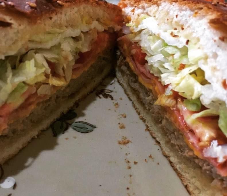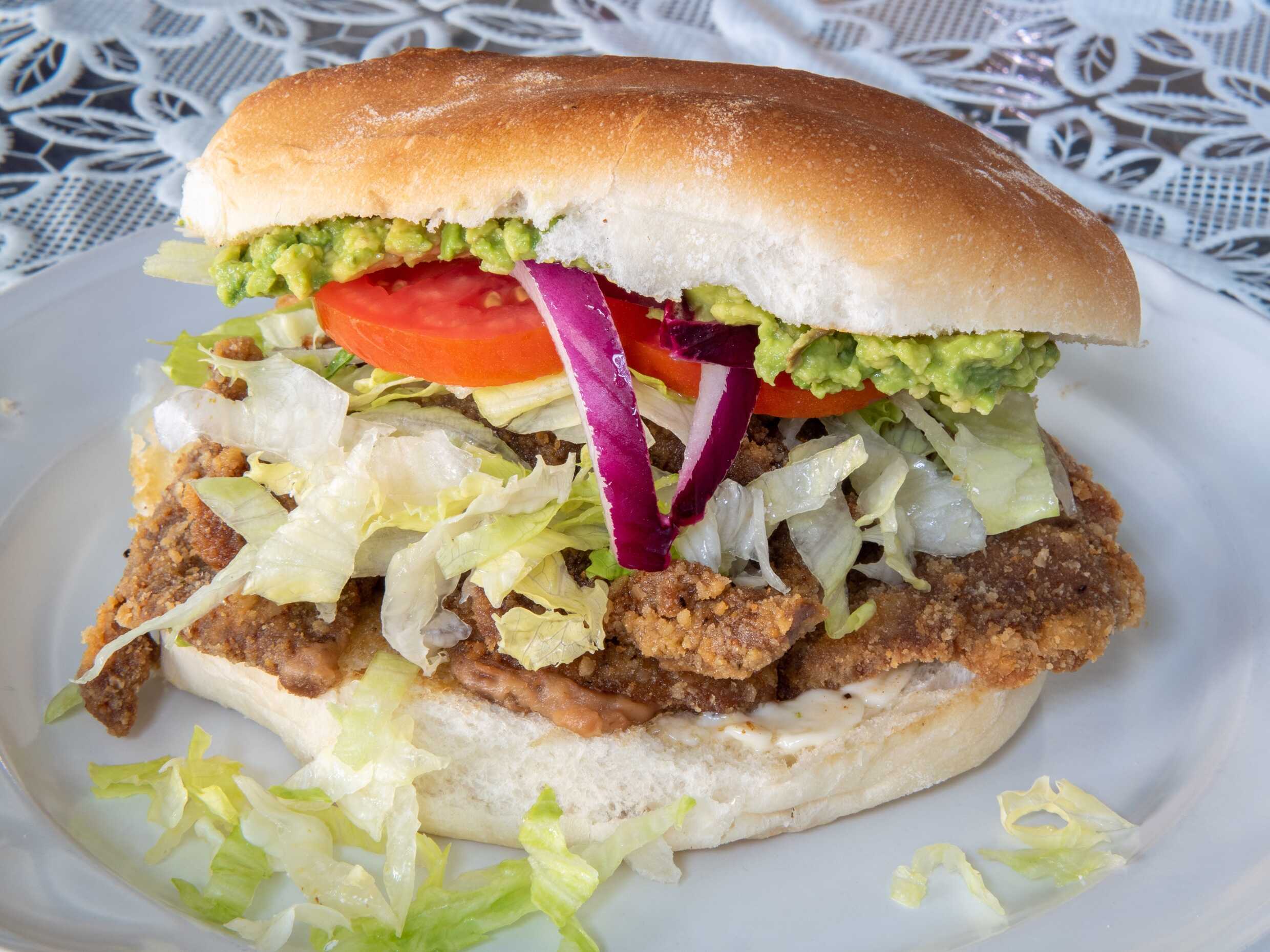 Filete de res empanizado con lechuga, tomate, cebolla y queso amarillo.