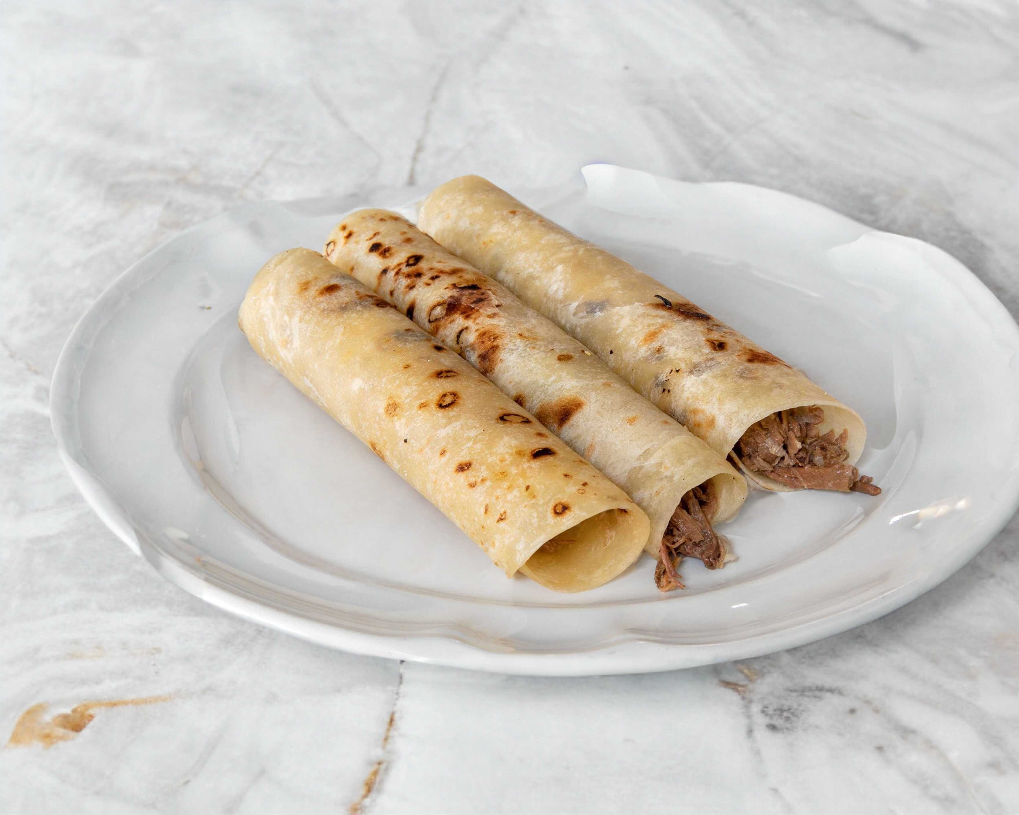 Cuatro tortillas de maíz rellenas de pollo, acompañado de ensalada del día, arroz y frijoles.