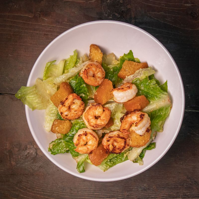 Ensalada césar con camarón fresco salteados con mantequilla.