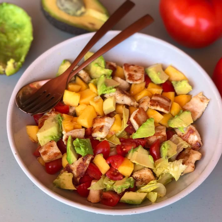 Lechuga romana, arándano, nuez de la india, mango, pechuga de pollo picado y aderezo de mango.