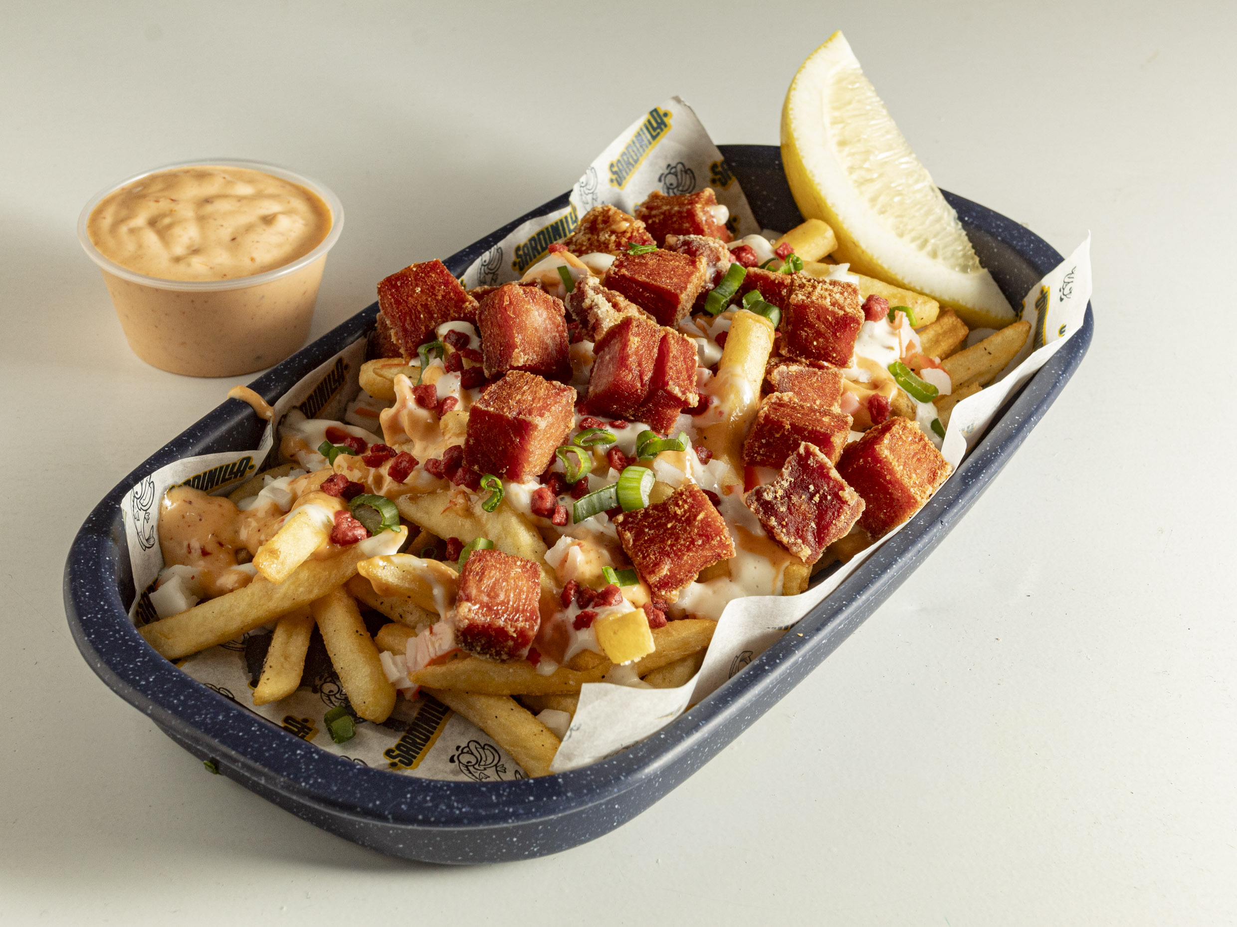 Papas a la francesa, chicharron de atún, ralladura de surimi, bites de tocino, cebollín, acompañados de aderezo ranch y spicy blue cheese.