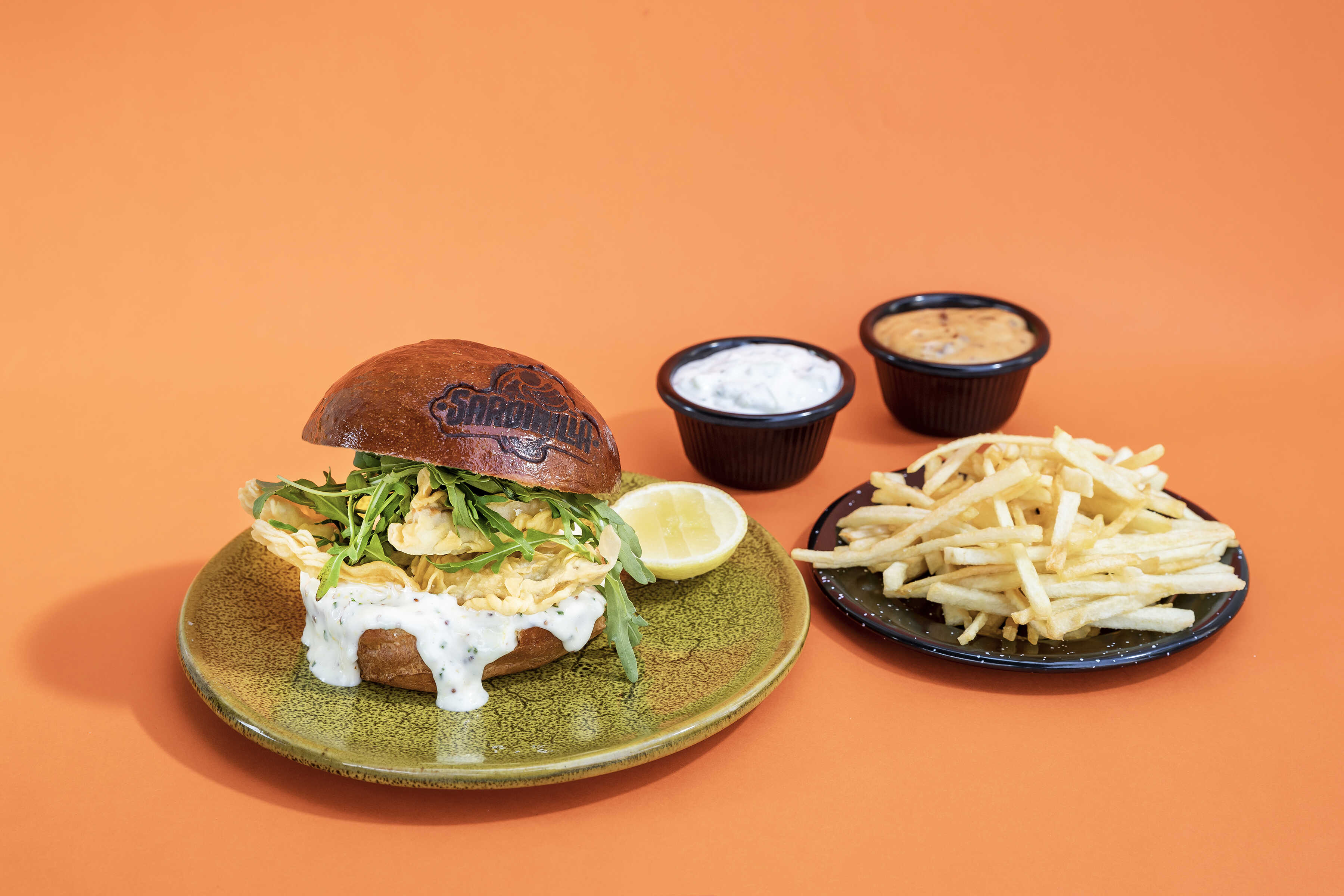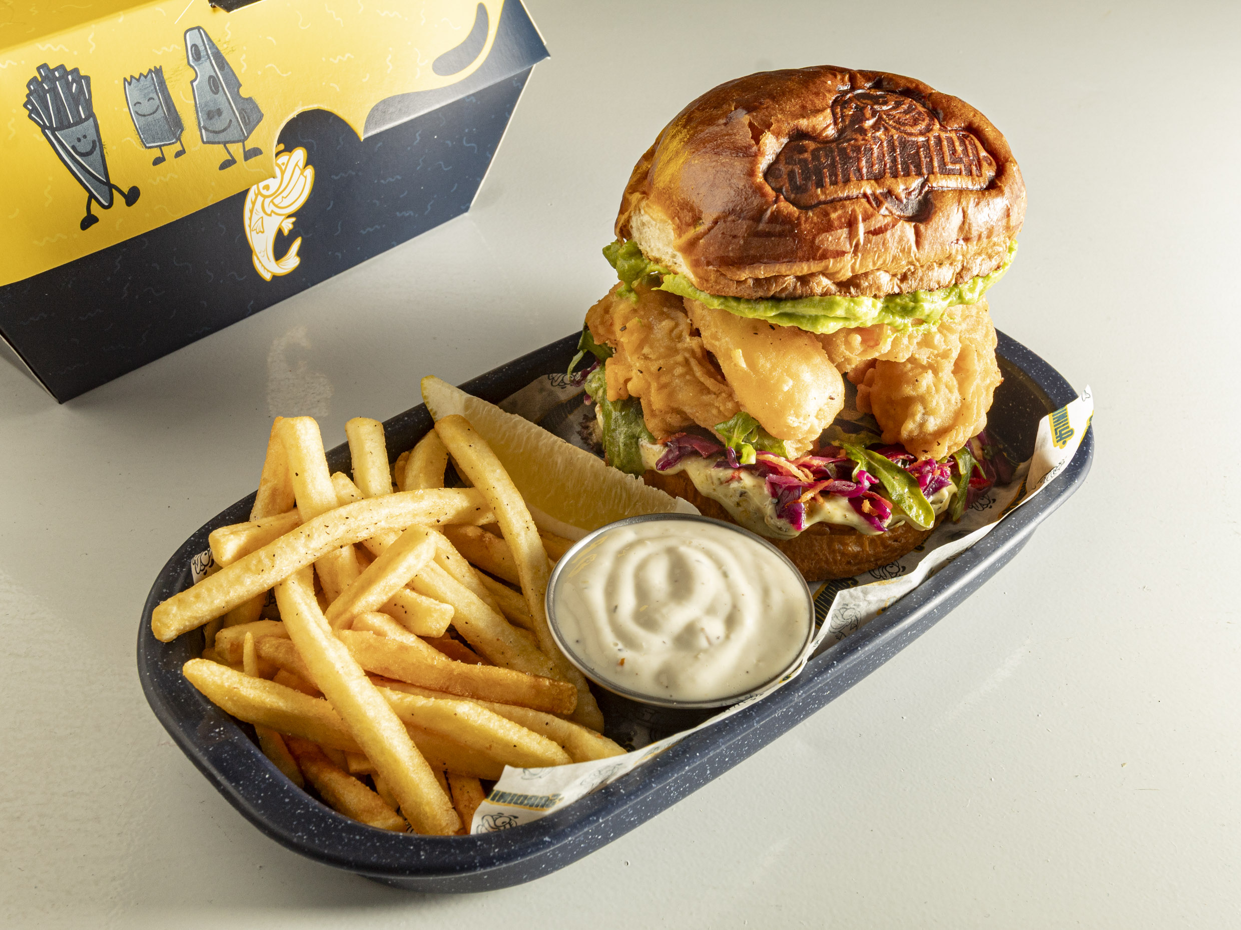 Pescado frito en pan brioche, cebolla encurtida, ensalada de col, pico de gallo, salsa tártara de la casa y aguacate, acompañado de limón amarillo.