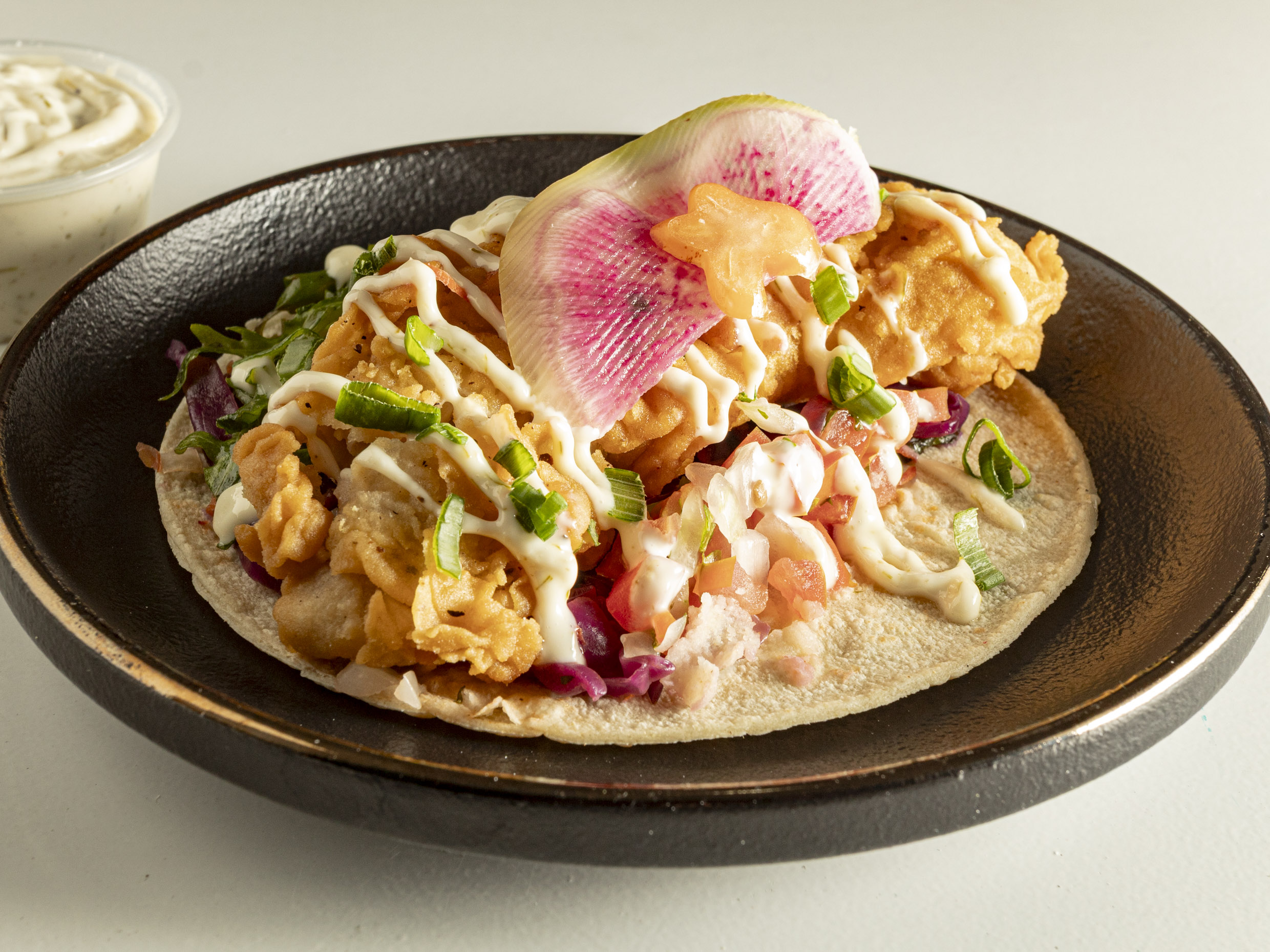 Pescado malvado: pescado frito, salsa tártara, pico de gallo, ensalada de col morada y arúgula montado sobre tortilla de maíz, con salsa de chipotle.