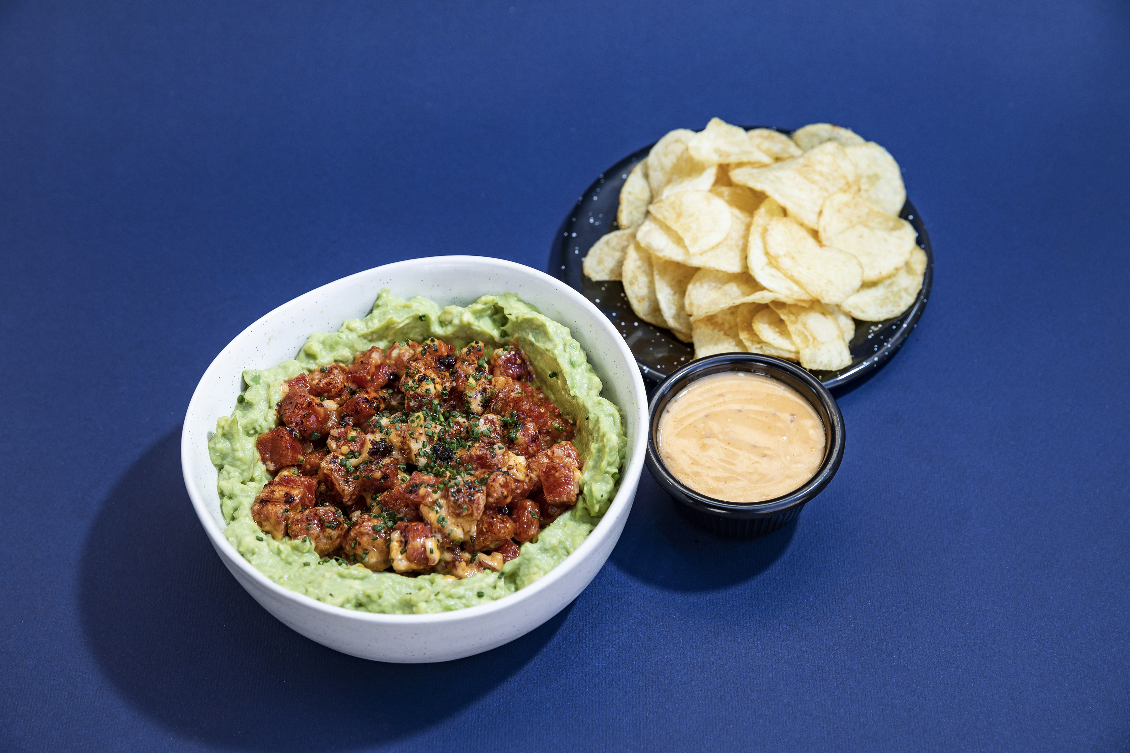 Chicharrón de atún con aderezo macha, servido sobre guacamole y acompañado de chips.