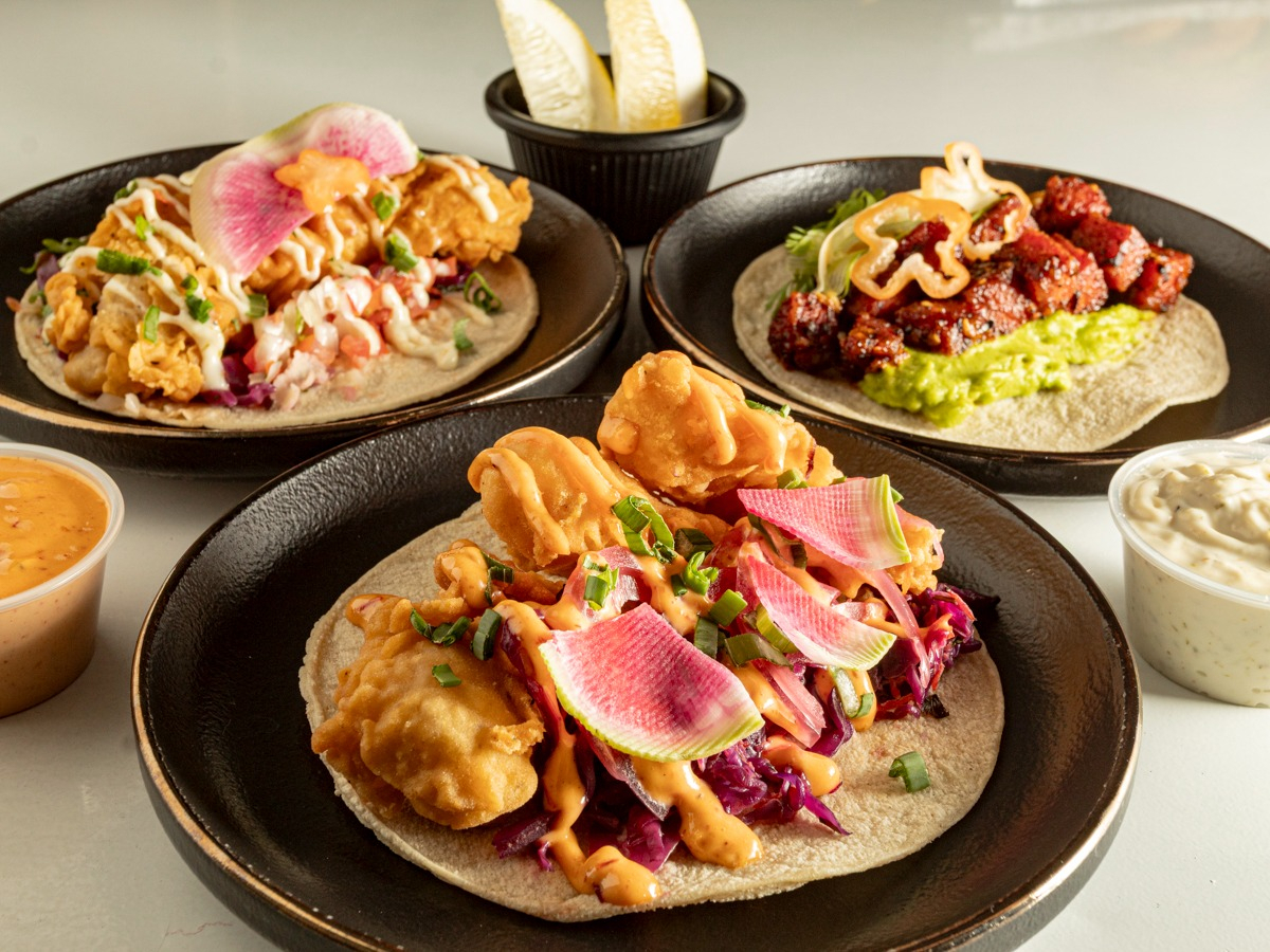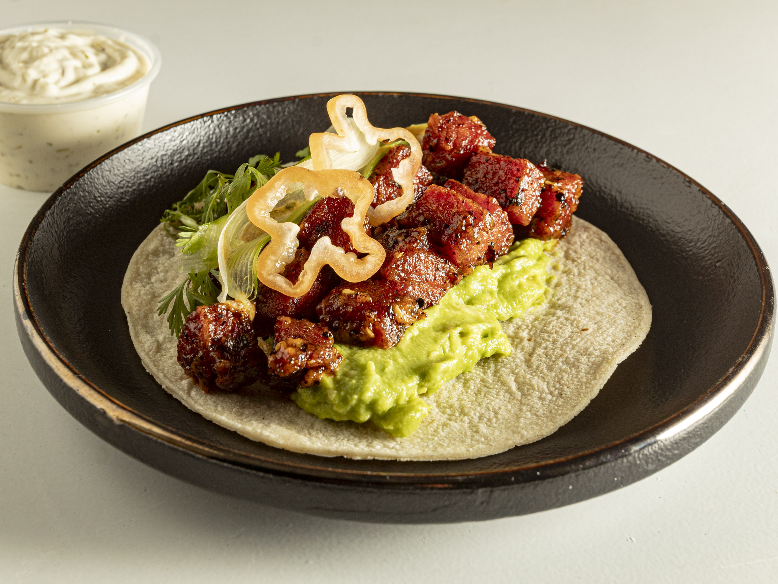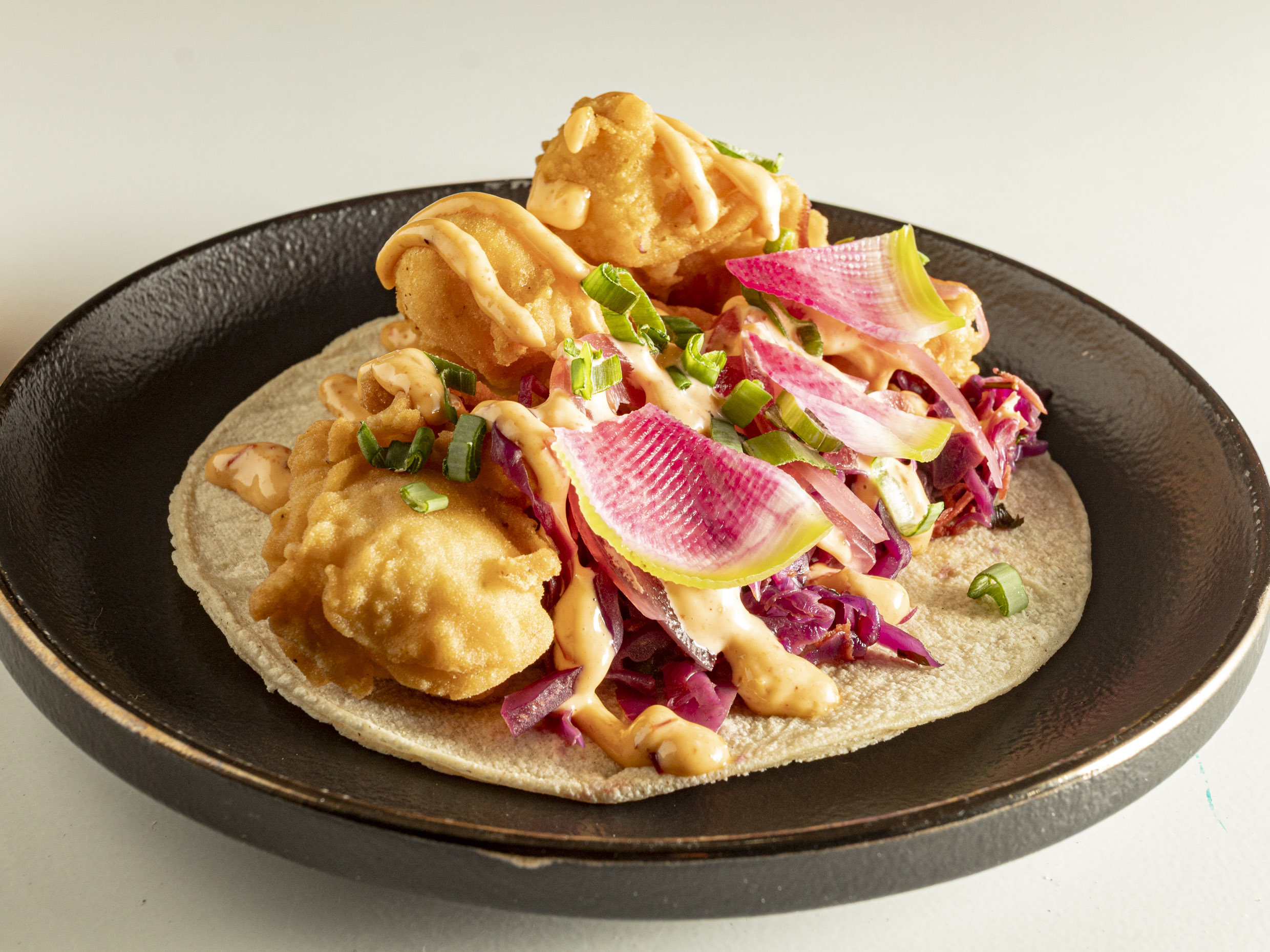 Camarón brutal: camarón frito, aderezo de chipotle, ensalada de col morada, cebolla encurtida y cebollín montado sobre tortilla de maíz, con salsa tártara.