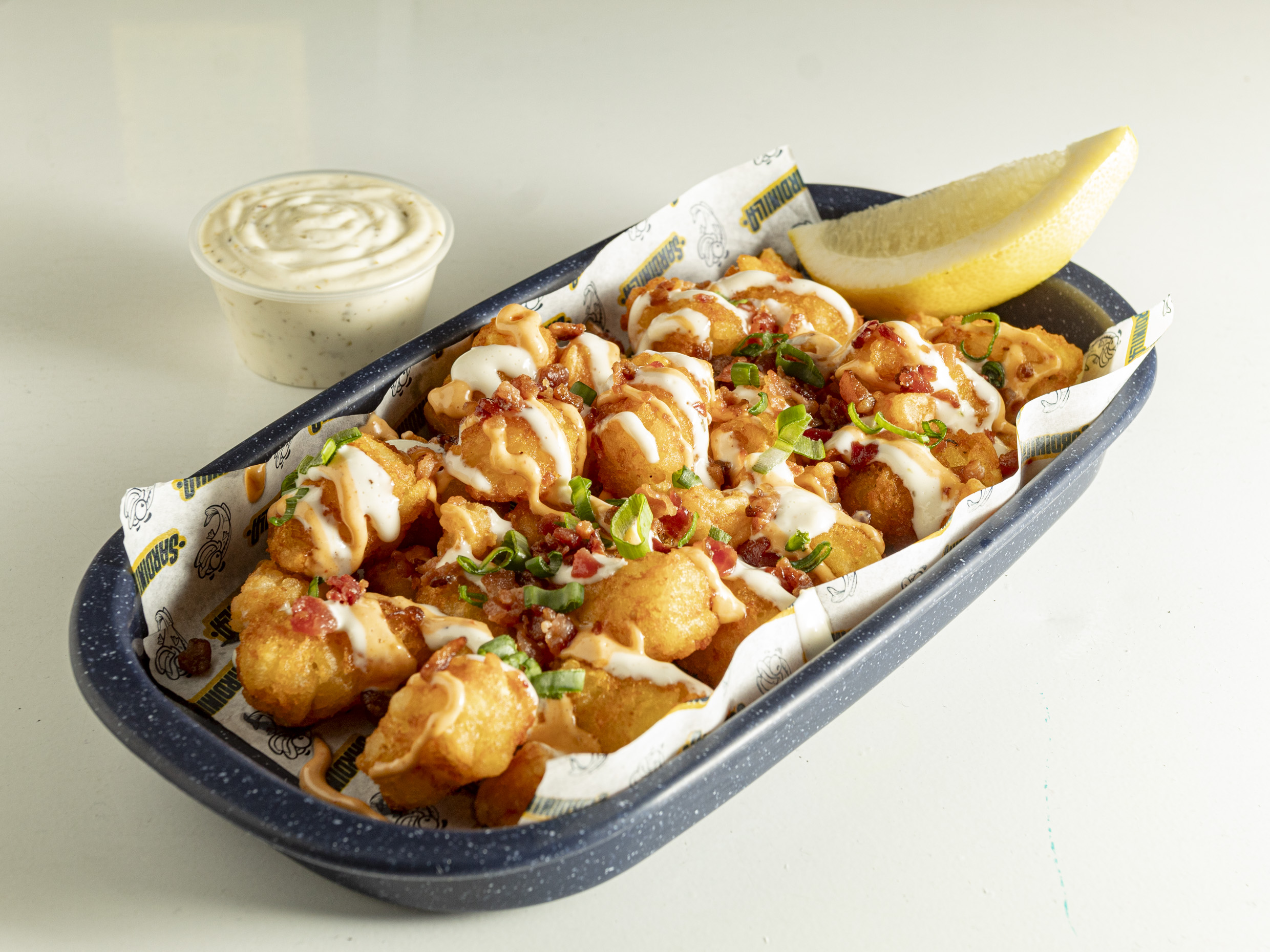 Bolitas crujientes de papa hash brown, chicharrón de camarón, cebollín y tocino, acompañados con aderezo chipotle y ranch.
