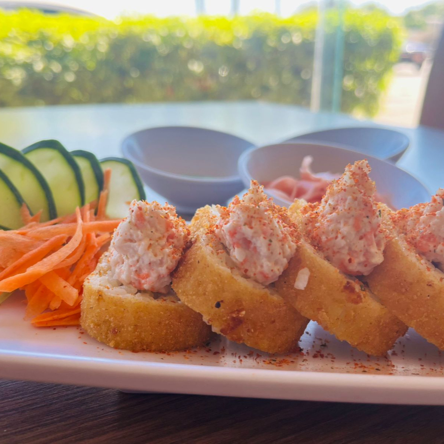 Preparado con empanizada, camarón, pepino, queso crema, aguacate, por fuera calabacita, pimiento rojo y furikake de camarón.
