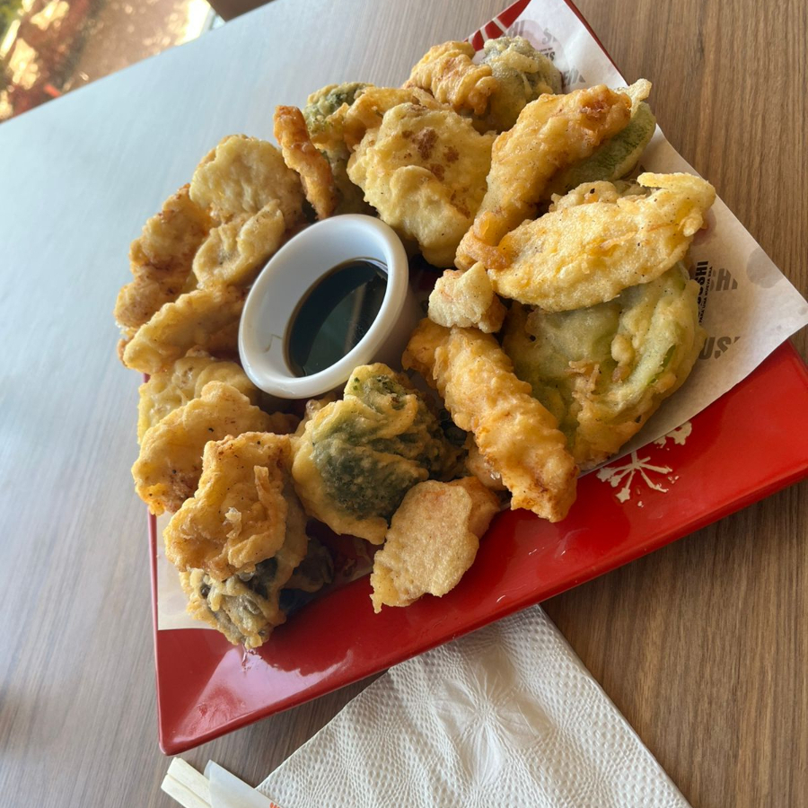 Exquisita tempura preparada con camarón y verduras capeadas.