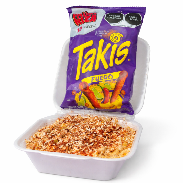 Buldak carbonara, granos de elote, mayonesa, crema, queso cotija, aderezo chipotle, chile en polvo y limón.