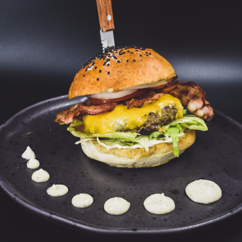 Tocino, queso blanco, queso cheddar, tomate, cebolla y lechuga