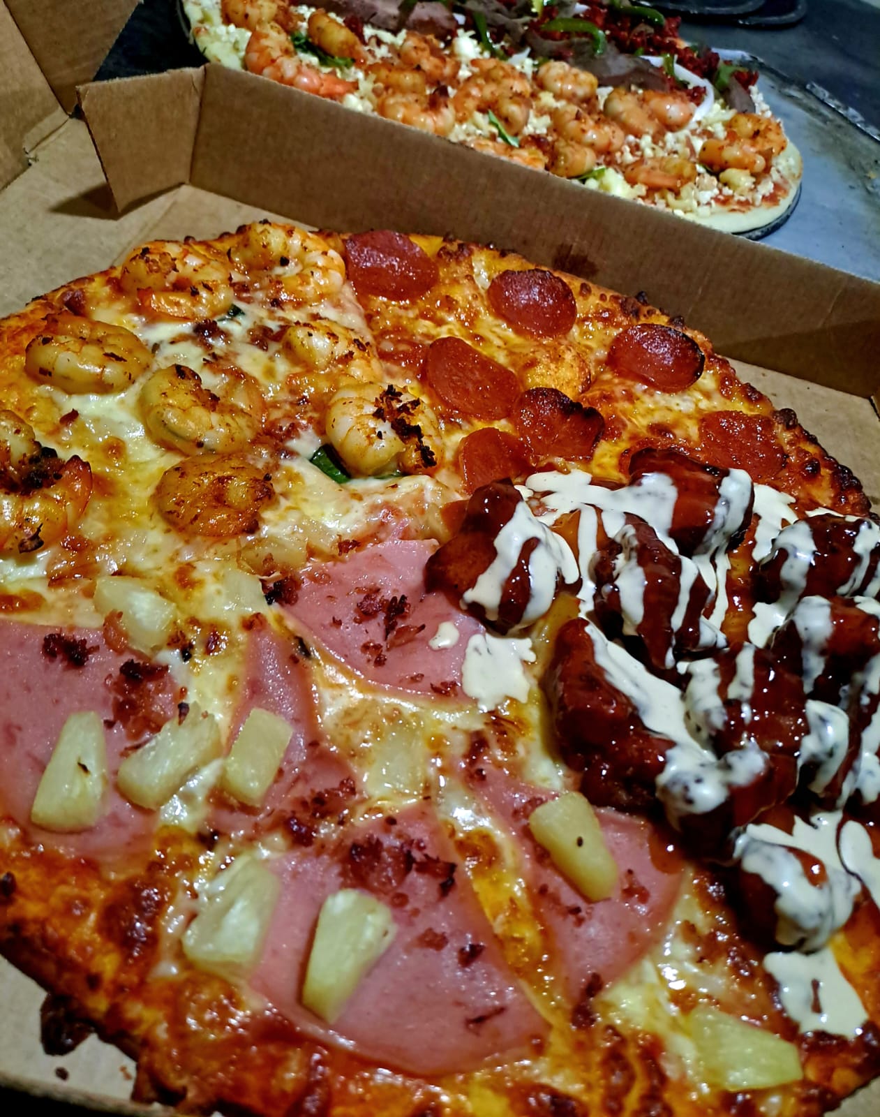 Pizza de 8 rebanadas: Boneless Búfalo, Camarón, Hawaiana o Pepperoni. Ideal para 4 personas.