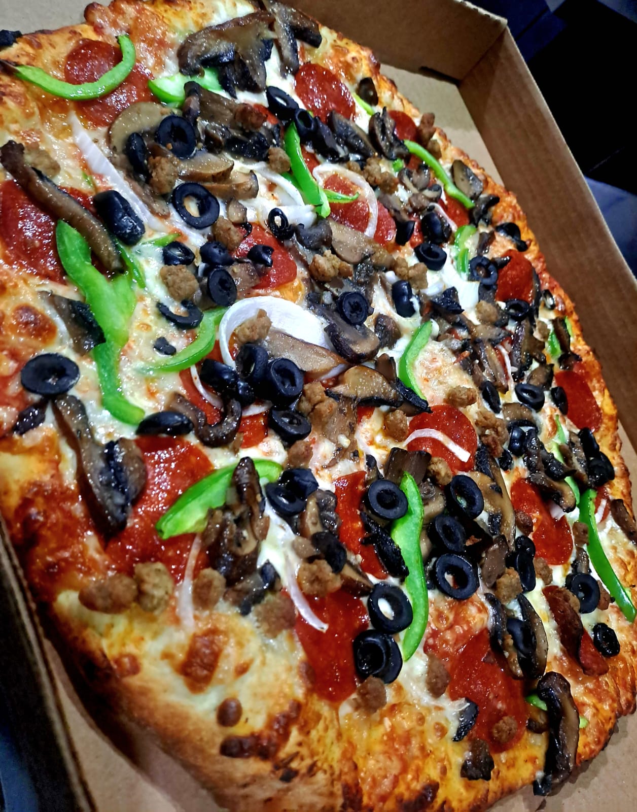 Pizza 8 rebanadas. Queso mozzarella, salsa tomate, Pepperoni, Salchicha Italiana , Champiñones, Pimiento verde y Aceituna negra