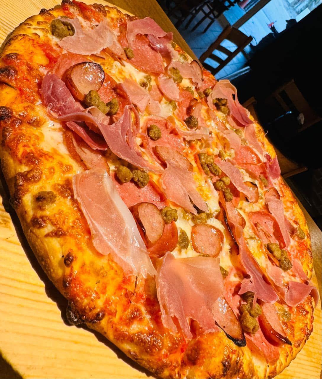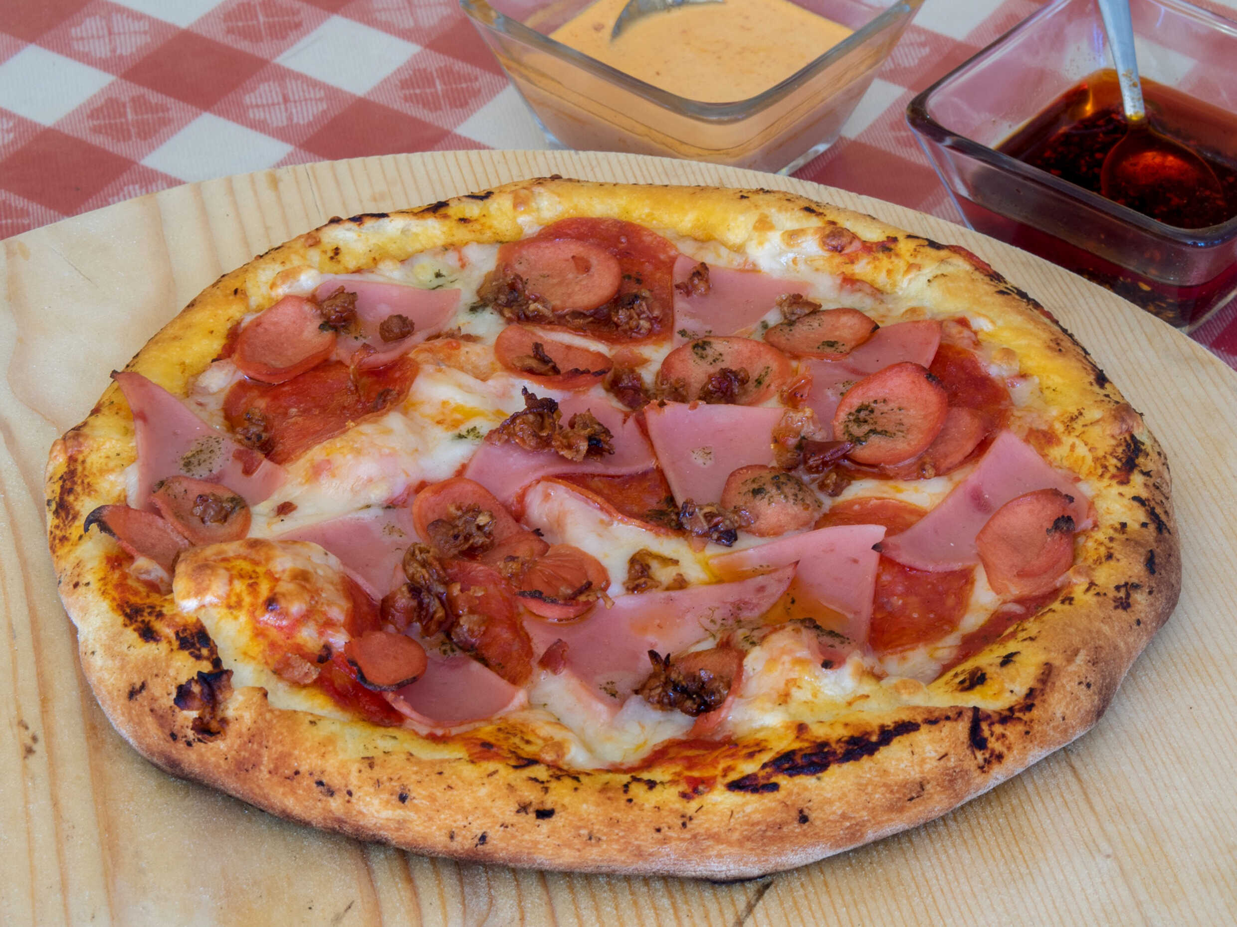 Pizza 6 rebanadas. Salsa de tomate, mozzarella, salami, salchicha italiana, jamon serrano, pepperoni y salchicha polaca.